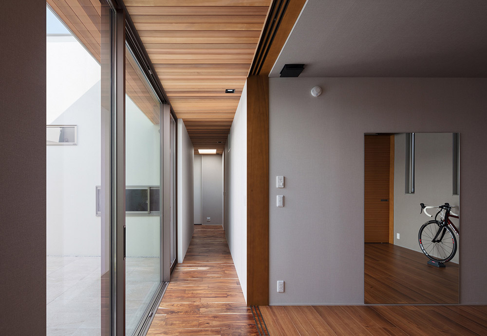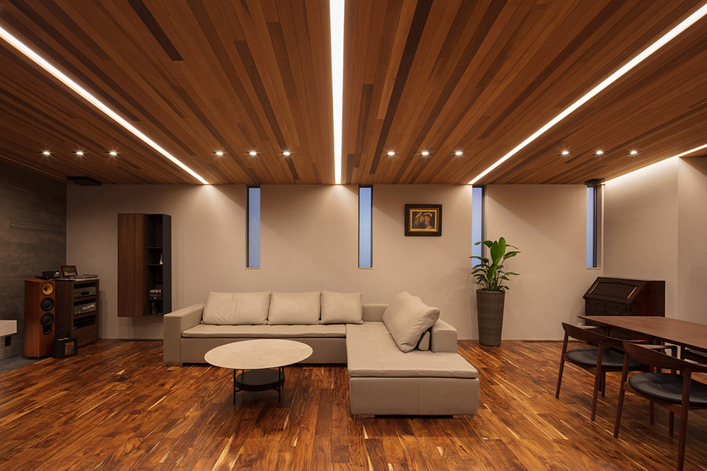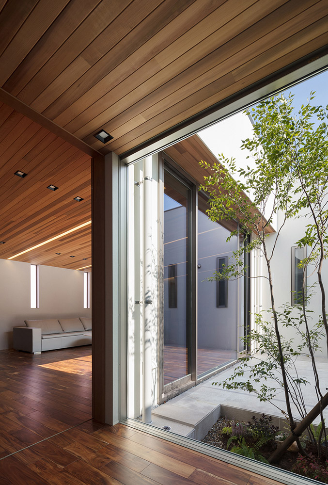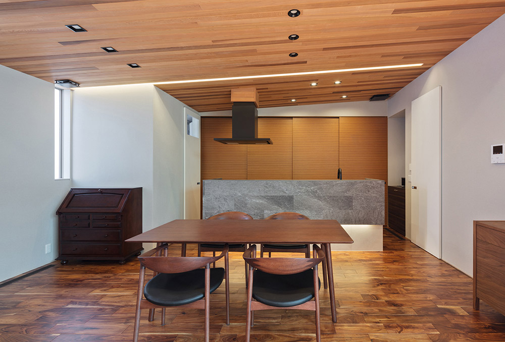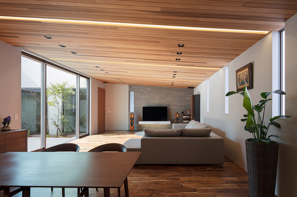 Thanks to the large windows open to the terrace, the house enjoys sufficient daylight and internal ventilation, while avoiding noise and direct view to the outside. On the ceiling of the interior space are red cedar planks which create a spacious and warm feeling