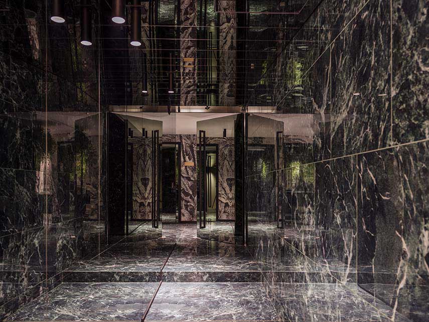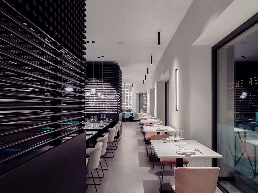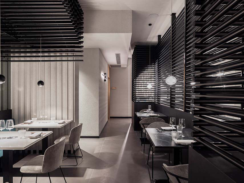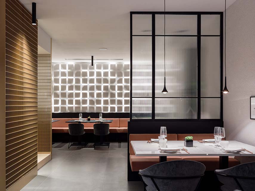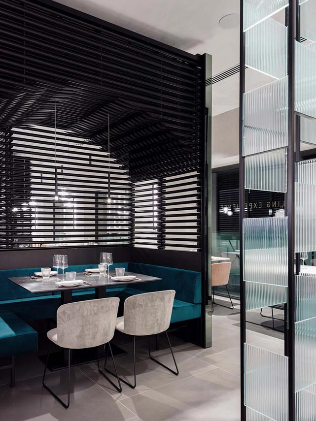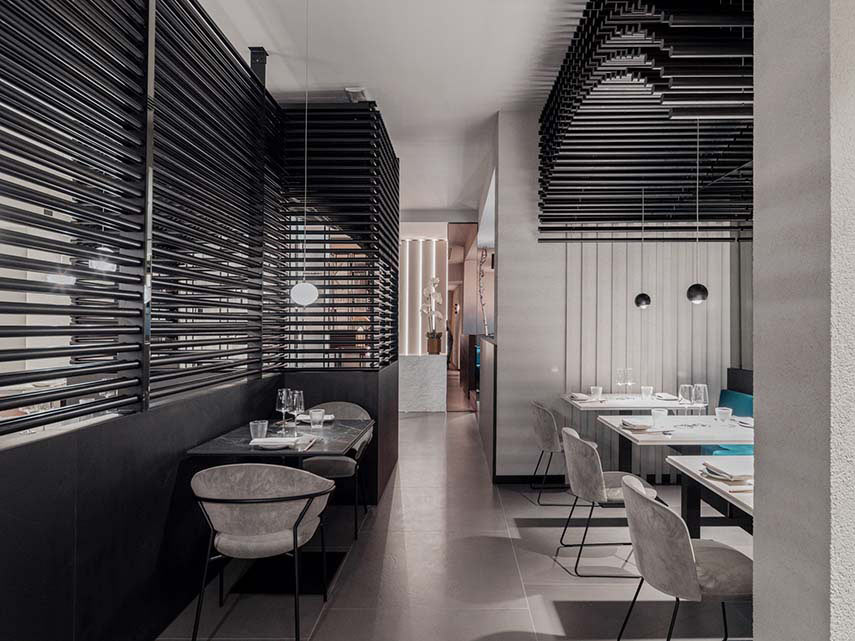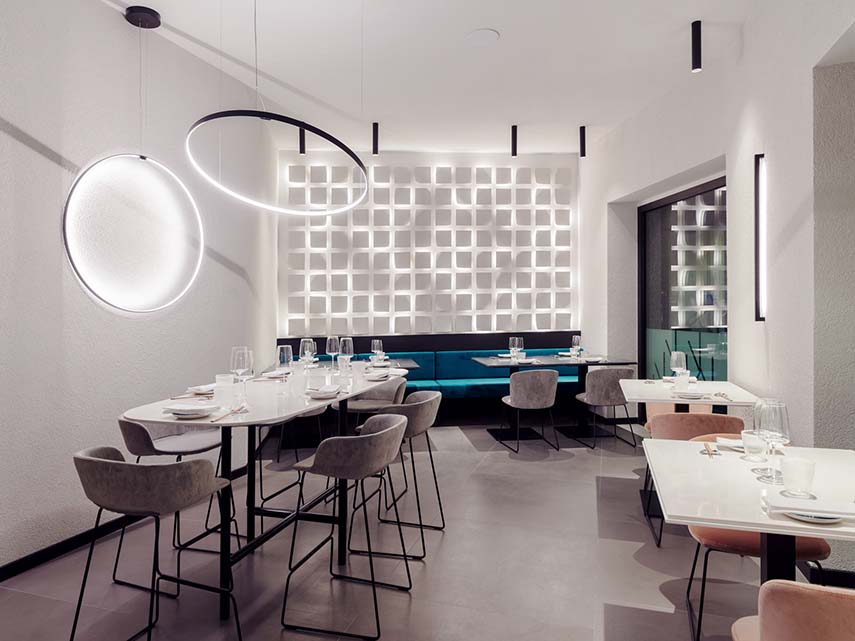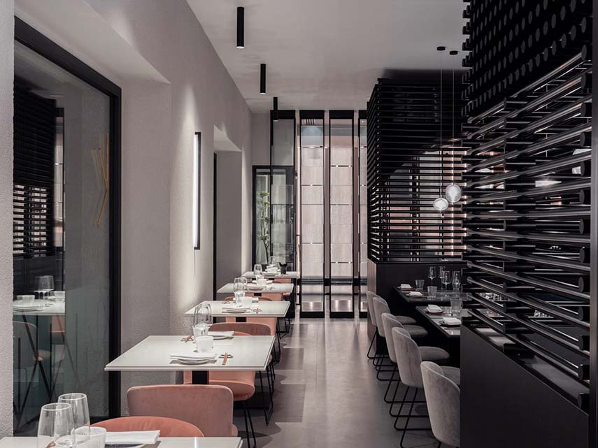 Fabio Gianoli, author of numerous interior design projects, is thinking of giving a different image to restaurant KANTO in Lecco. Starting from the same black tubular structure, he adds brighter elements and details in precious materials such as marbles and pastel-colored velvets