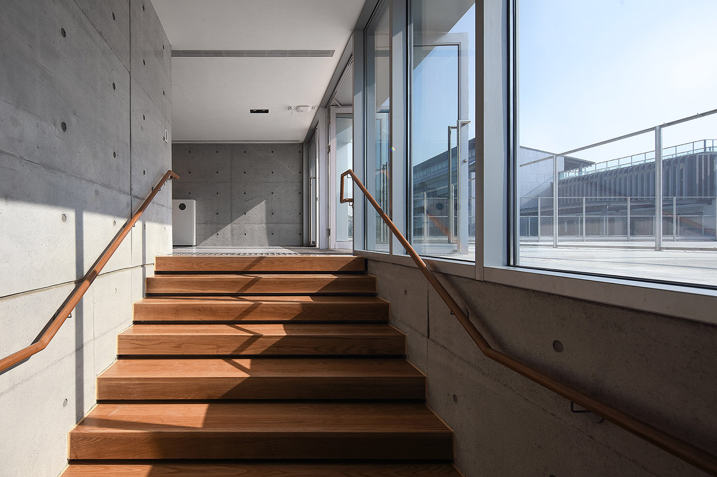 The V-shaped steel structure supports the gym, creating a floating perception. The tall ribbon windows of the gym, located at street level, visually connect it to the outdoor soccer field, creating a unique visual panorama.