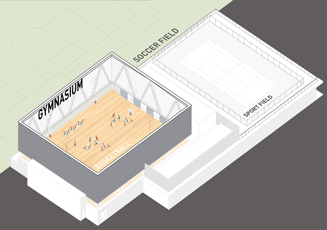 Sports facilities such as gyms and swimming pools are typically conceived as stand-alone "black boxes" integrated into school campuses, in contrast to other buildings often formed by smaller and repetitive units. However, in this case, the intention was to break the norm of this typology by creating a "transparent" sports facility