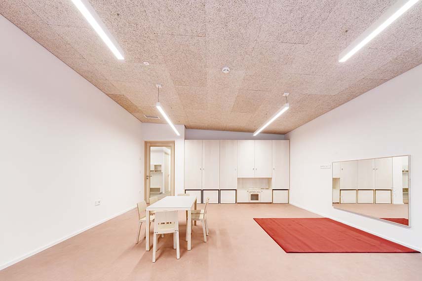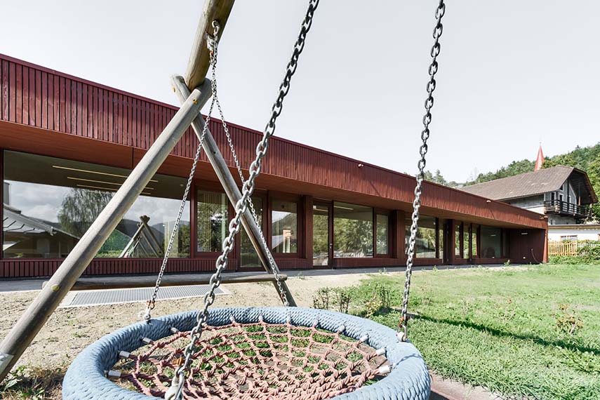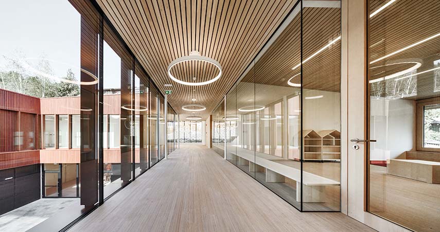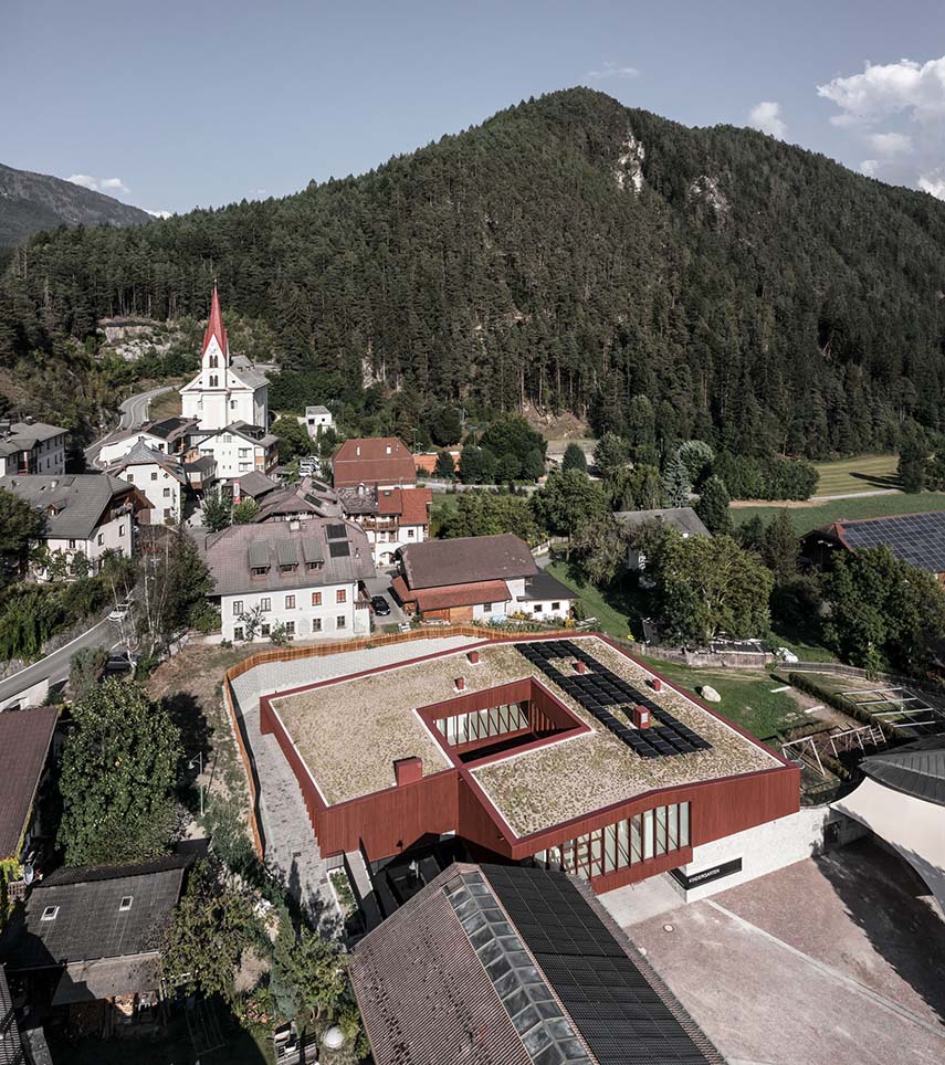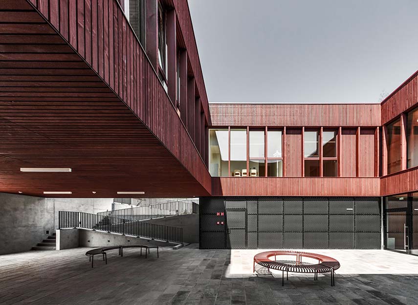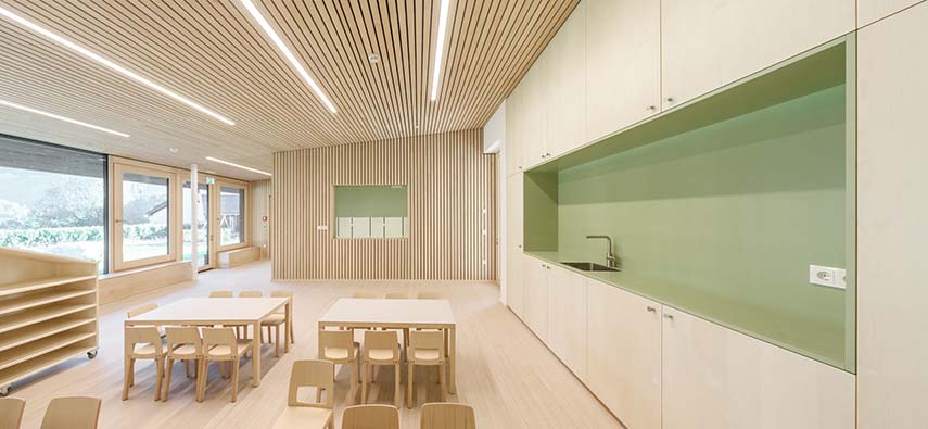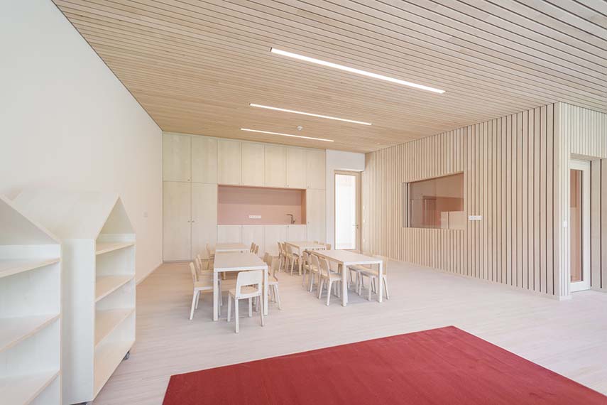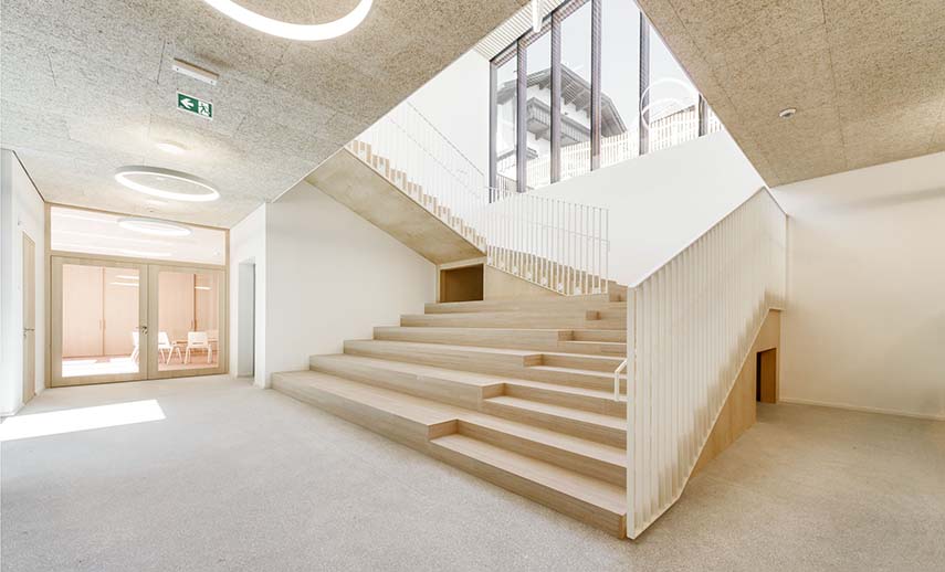 The new school complex designed by Roland Baldi Architects is located in the strategic position occupied by the old nursery school, between the elementary school and the public spaces of the center. This choice strengthens urban continuity and transforms the building into a daily reference point. The external zig-zag ramp overcomes the four-meter height difference and ensures barrier-free access, connecting the nursery school to the upper part of the village and the church. A simple but significant solution, confirming how even architectural projects can become tools for inclusion.