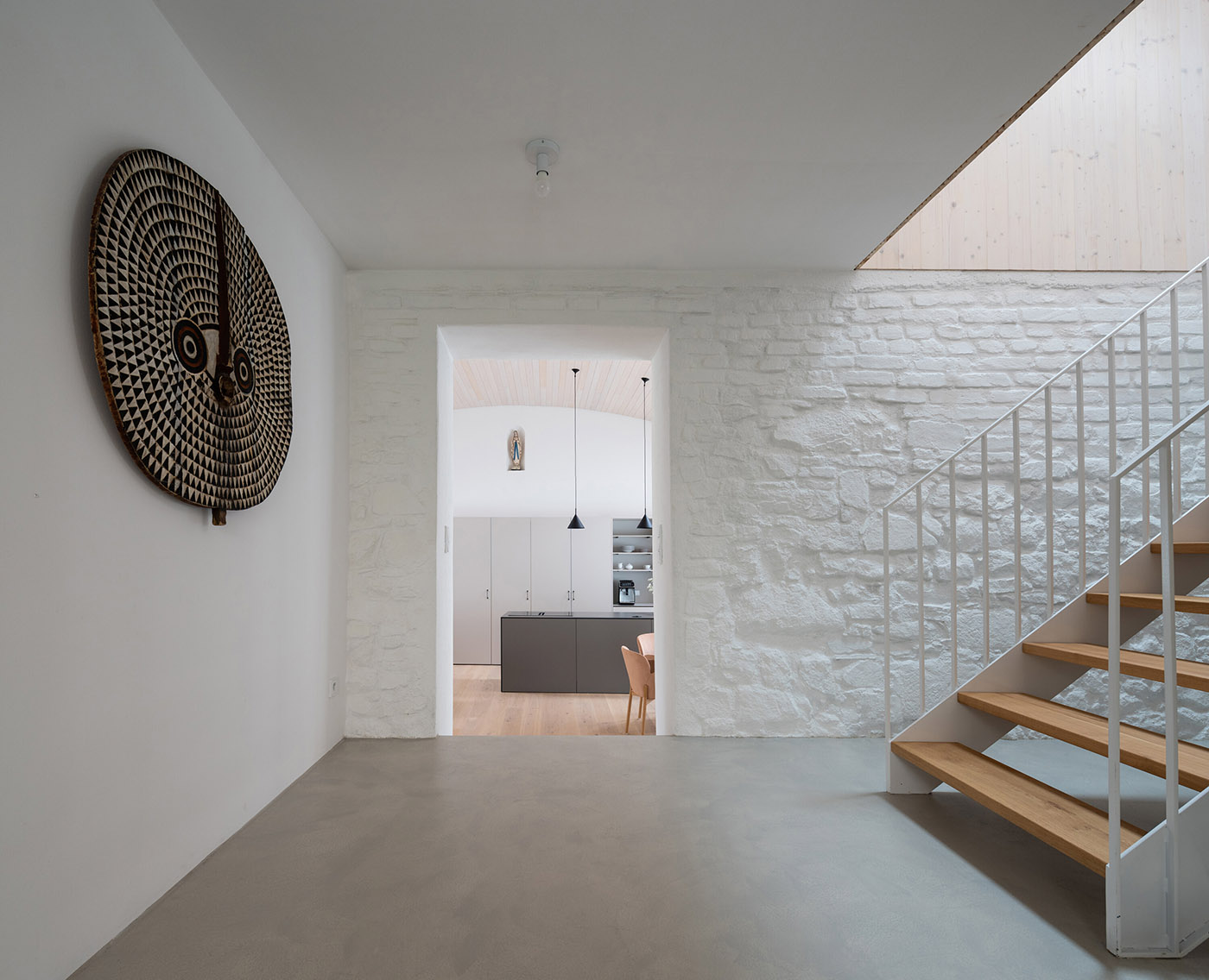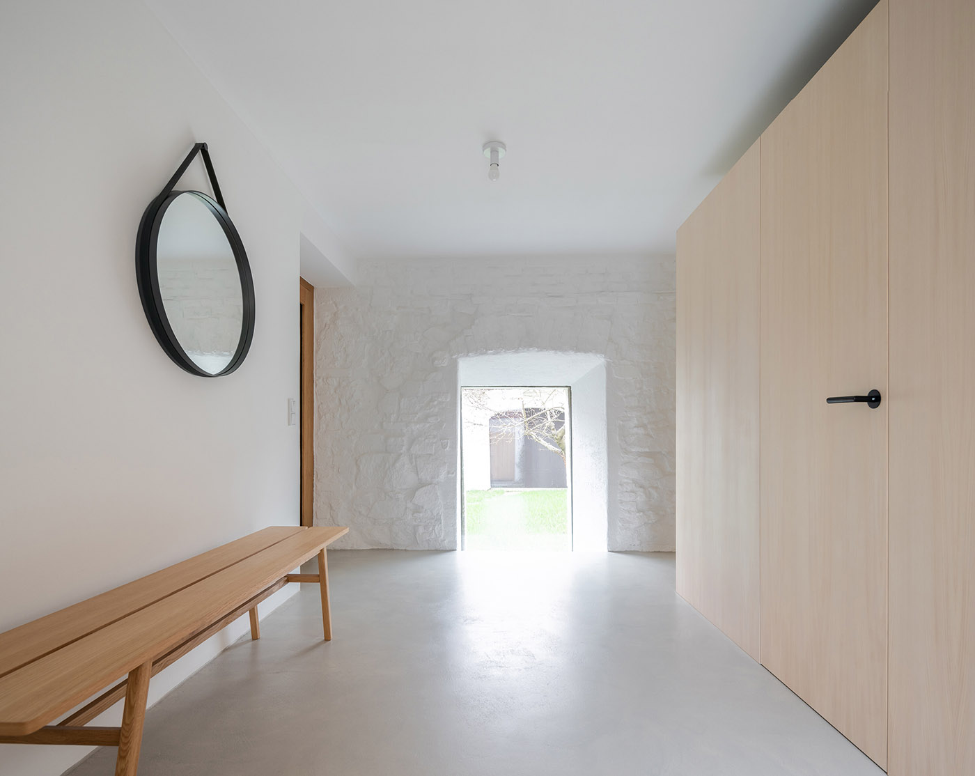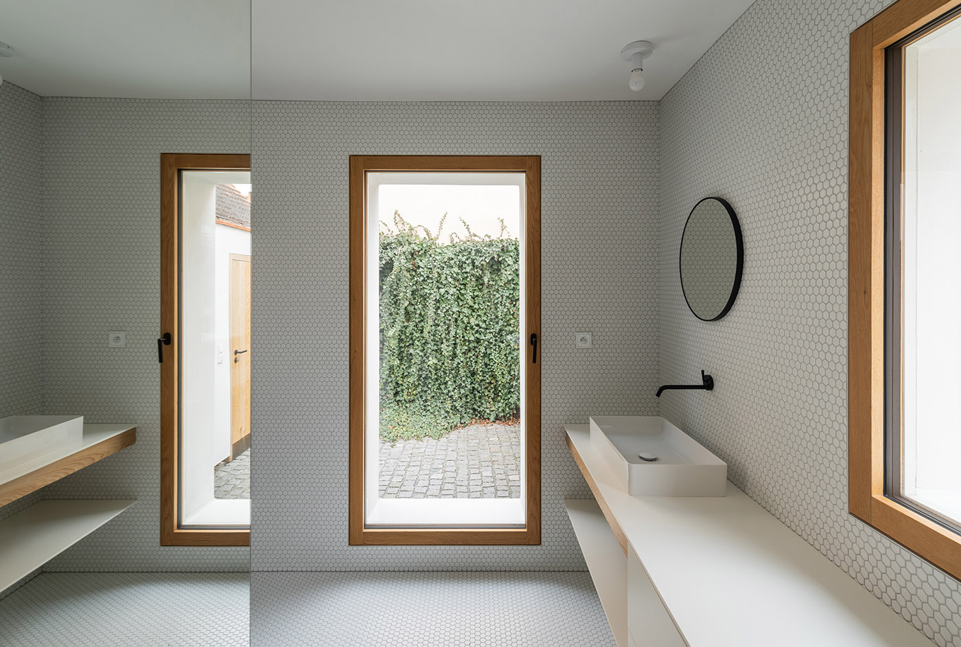 The interior layout was adjusted to make the building accessible on two sides: for pedestrians on the square side and for cars on the opposite side. The large window in the gable of the courtyard facade is a response to the unique view of the church tower. The views from inside the courtyards enrich the overall perception of the space. The new openings were intentionally left minimal, to accentuate the contrast with the original windows.
