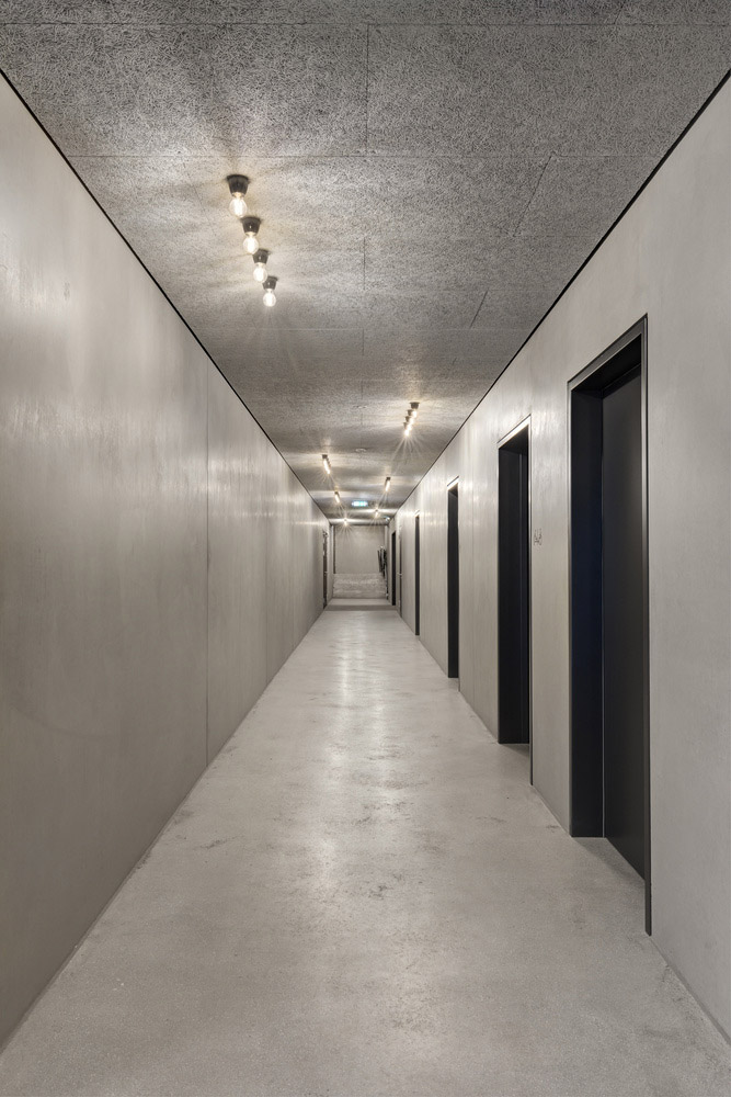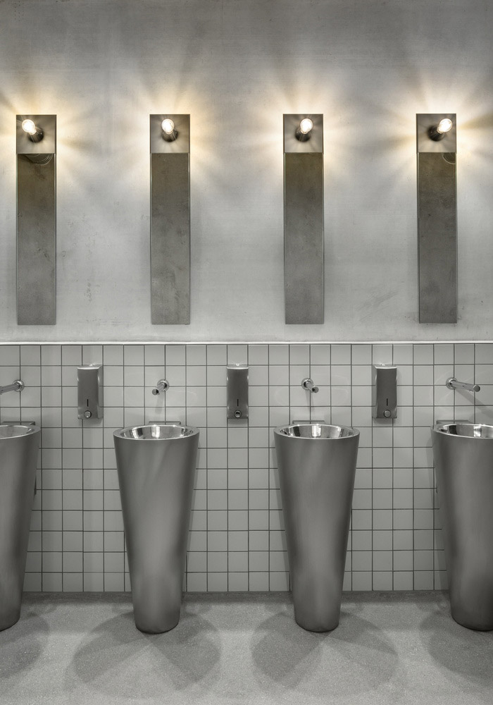 The interior design is very simply designed with inexpensive materials. The bathrooms are very understated with stainless steel items and simple lights and thin, minimal mirrors. Herringbone cladding in the lobby with several joints is used to regulate the acoustics of the room, adjusting the reverberation time as well as to reinforce the roof and walls