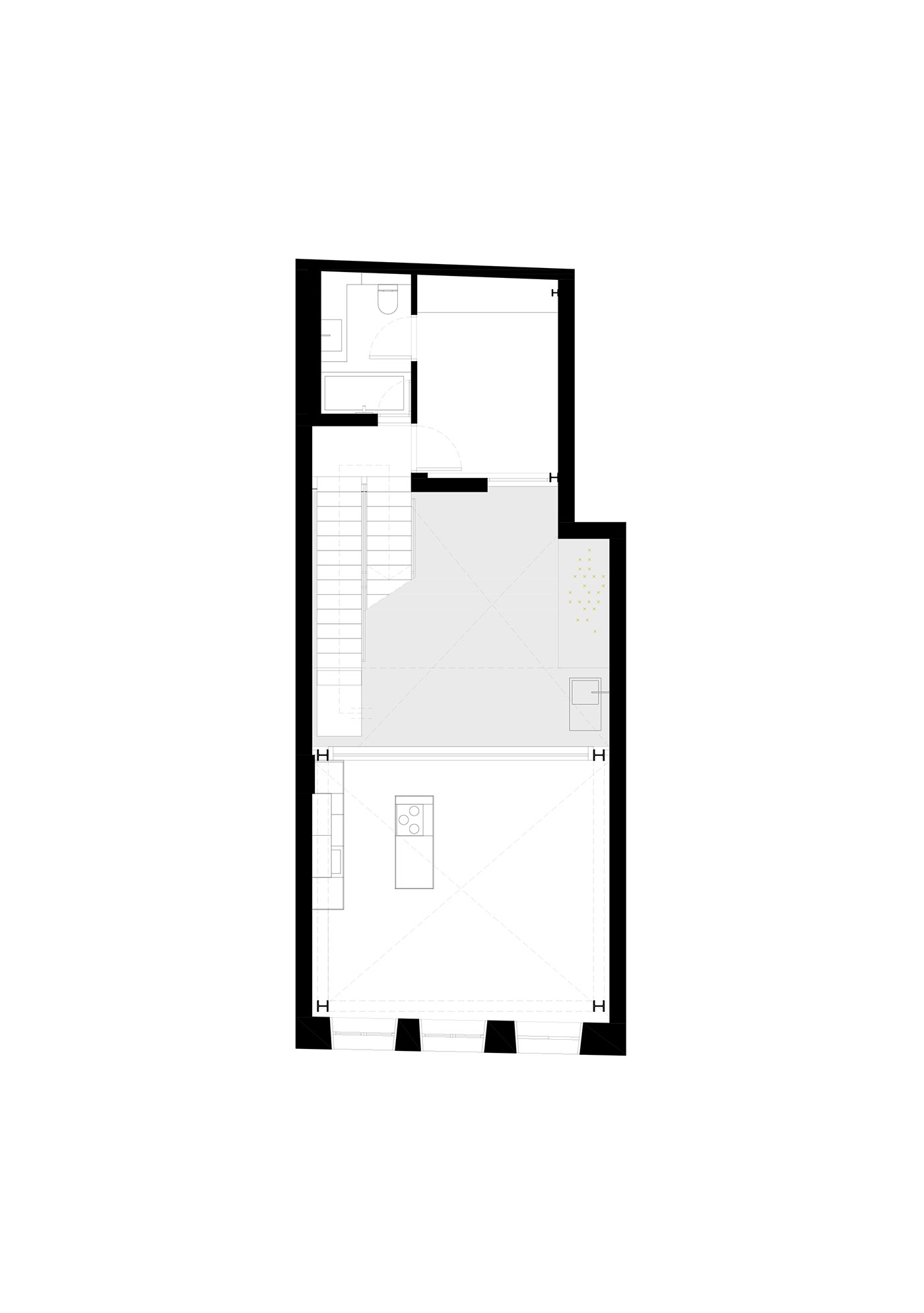 The second floor of the building is set back from the façade line, reducing its presence on the street and generating a terrace for the master bedroom
