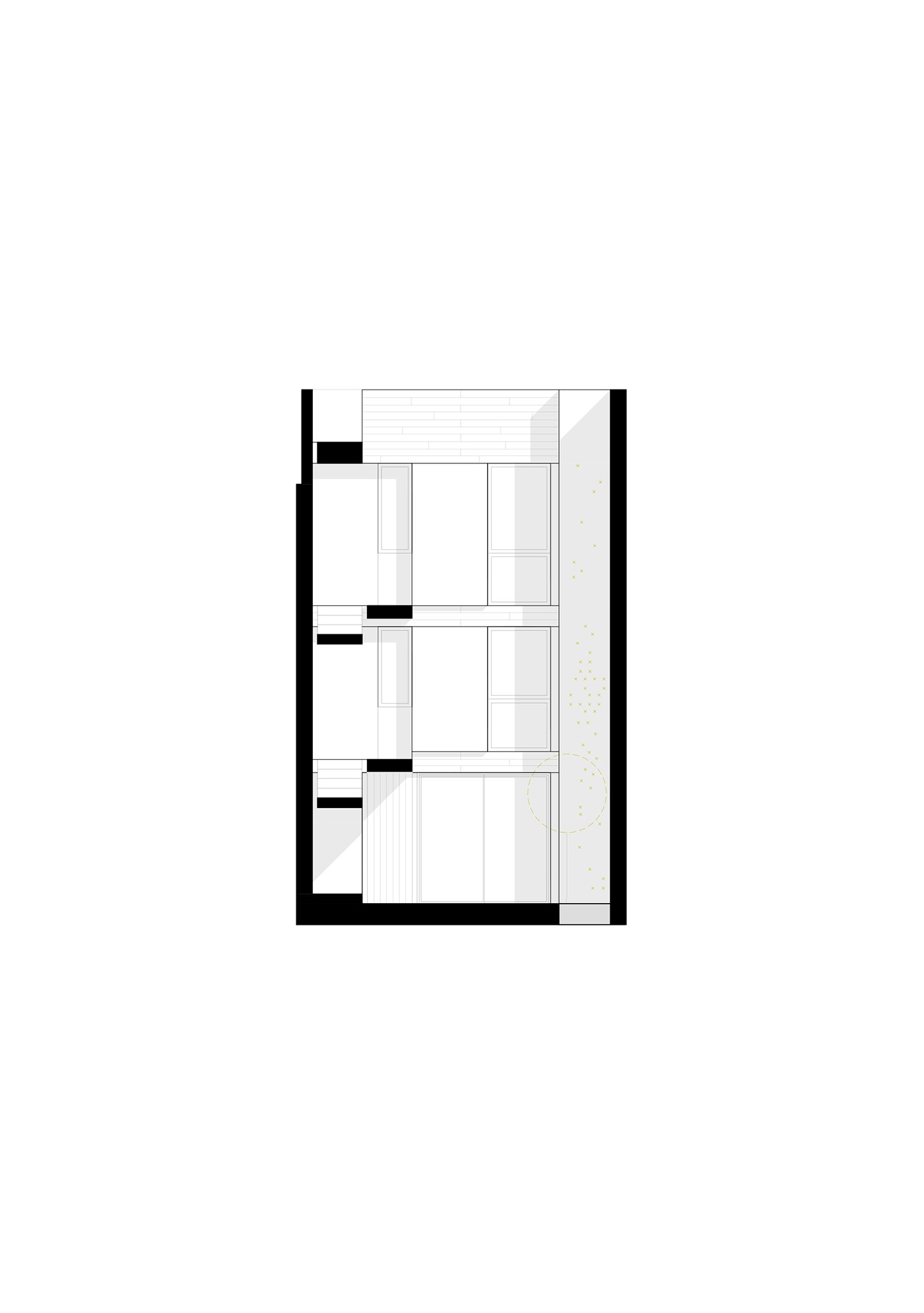 The existing small ventilation patio is enlarged, occupying the entire transverse center line of the building-side to side of the lot-becoming the true center of the house.