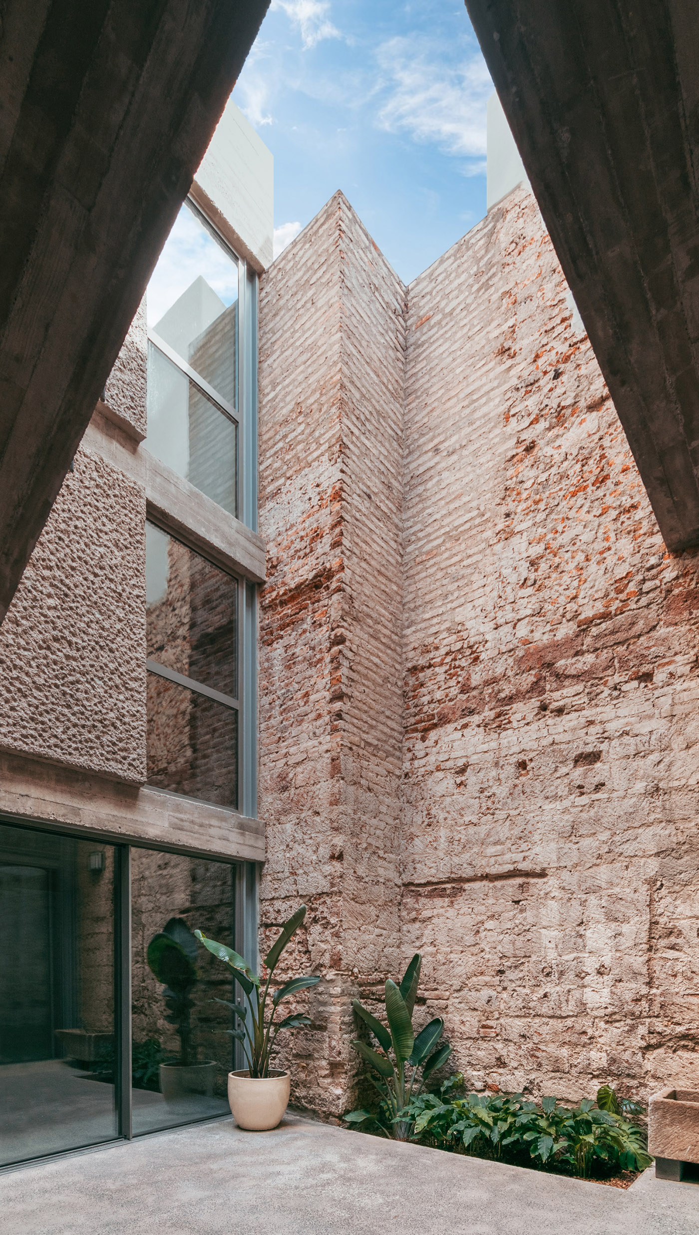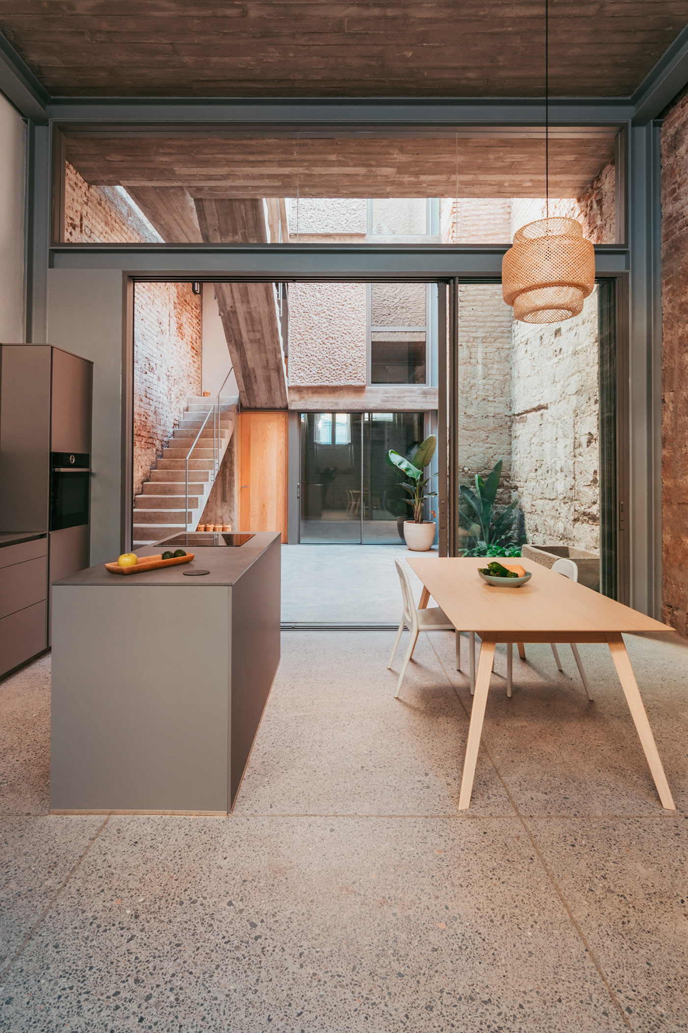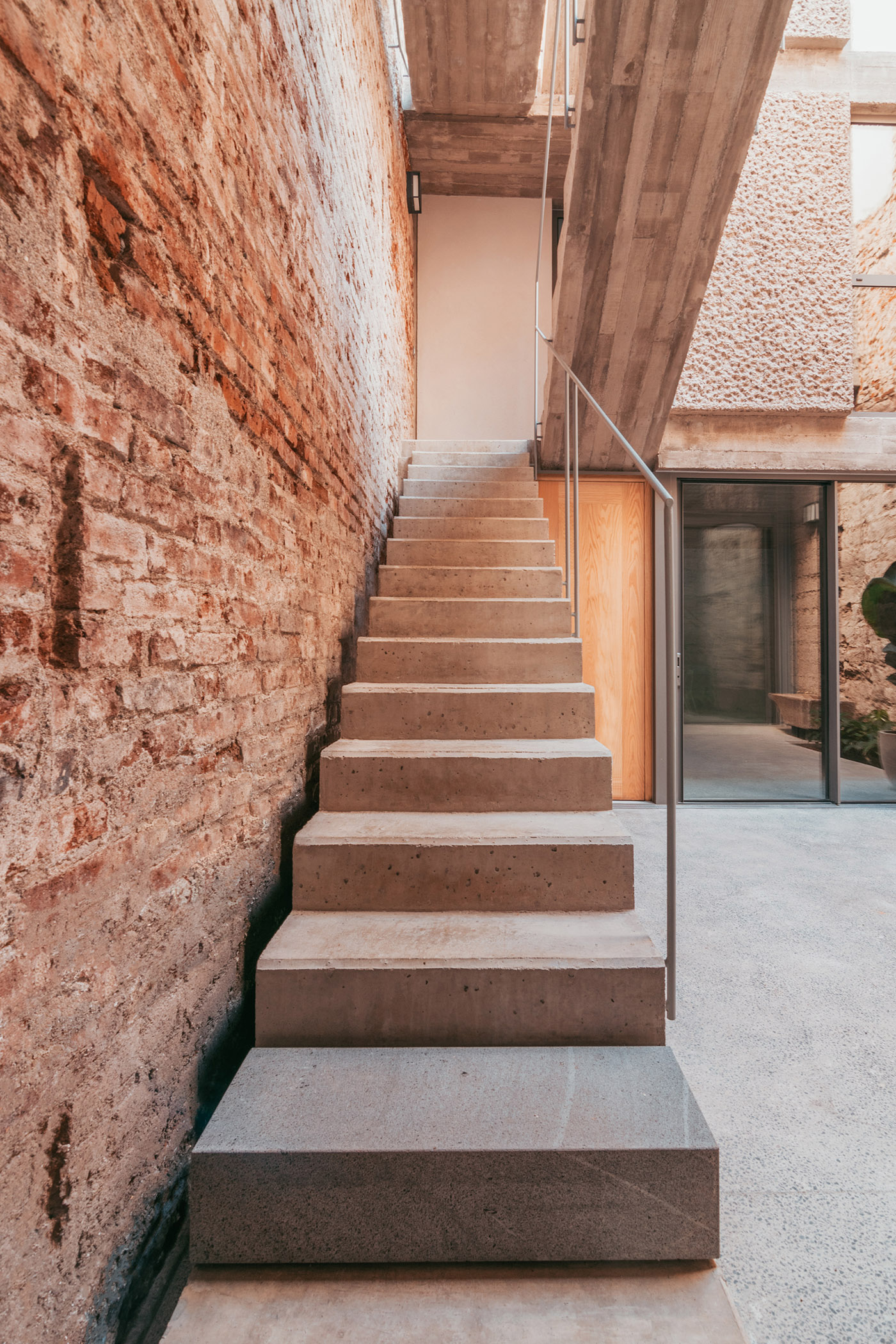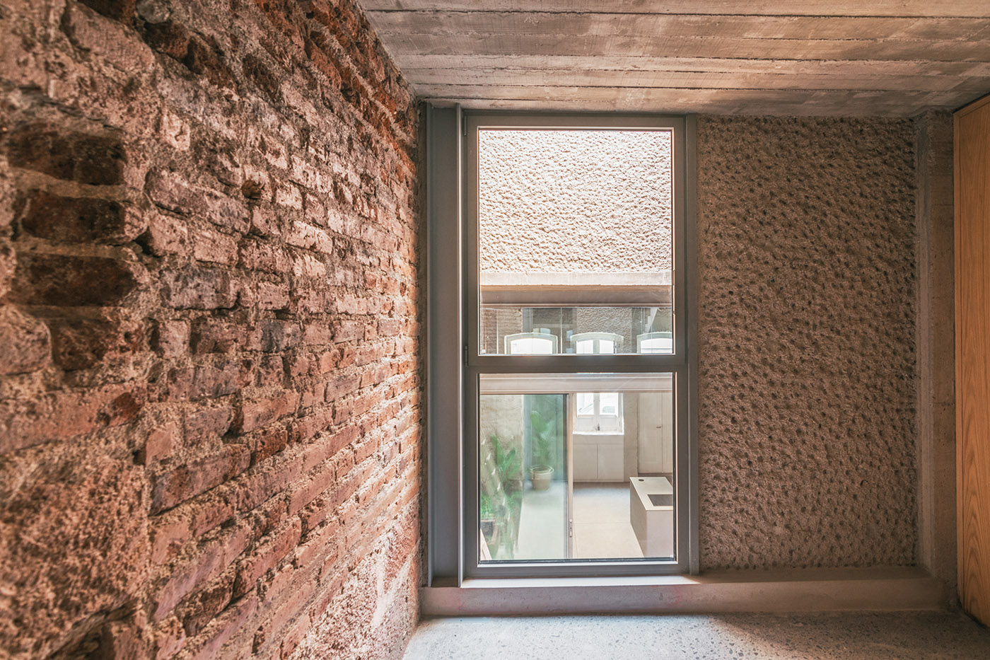 As for the moodboard of materials, architect Bautell chooses to leave the existing walls of the envelope bare, with exposed brick, or finished with lime mortar. The part of the La Toscalera House built new is made of concrete left exposed with different finishes