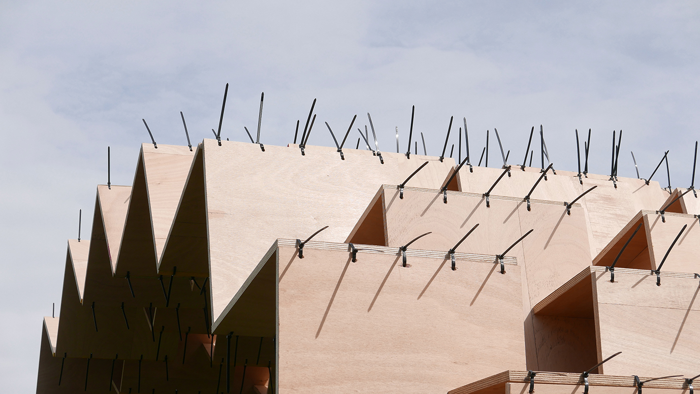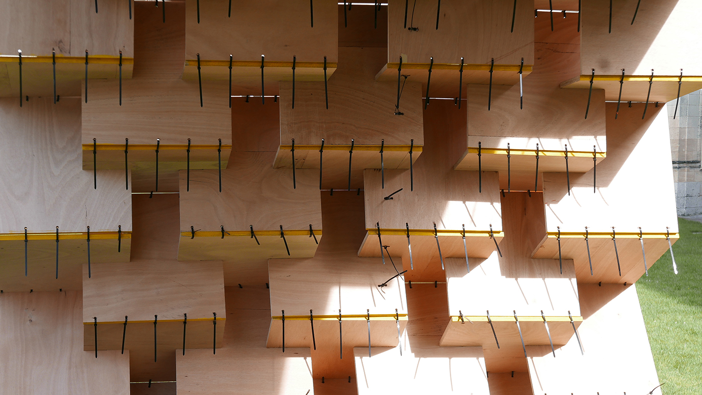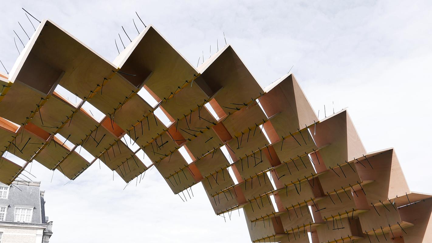 Al confine tra architettura e design, queste opere mettono in discussione il legame con il materiale, i dettagli di assemblaggio, il volume e la ricerca di stabilità attraverso gli incastri e il ripiegamento del legno. L'arco della fisarmonica è formato da 182 pannelli di compensato di 22 mm di spessore e 890 “collari” di bloccaggio in plastica. È autoportante e irrigidito con rinforzi diamantati in compensato inseriti tra i moduli. Nella struttura non è presente nessuna vite e gli unici dettagli sono le tacche in legno e le “cuciture” con collari di serraggio