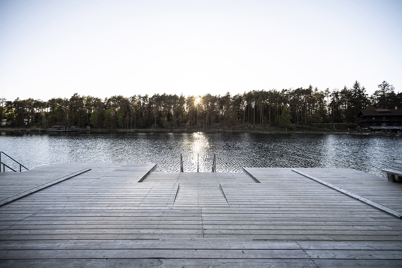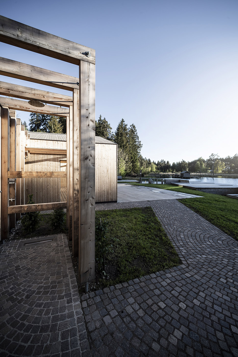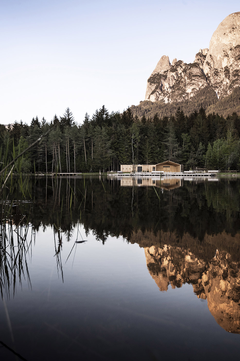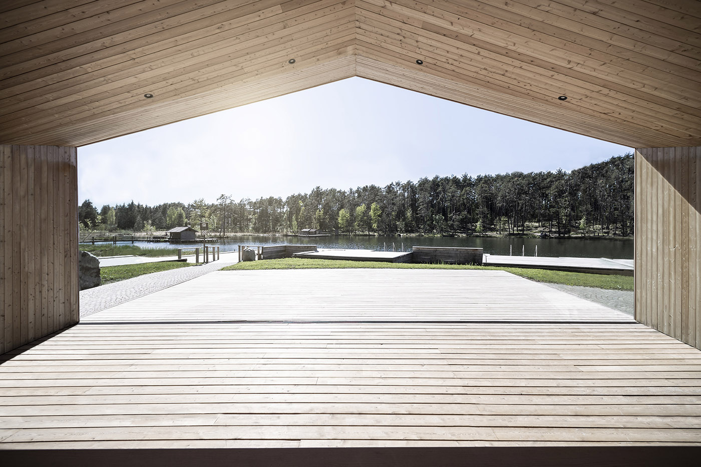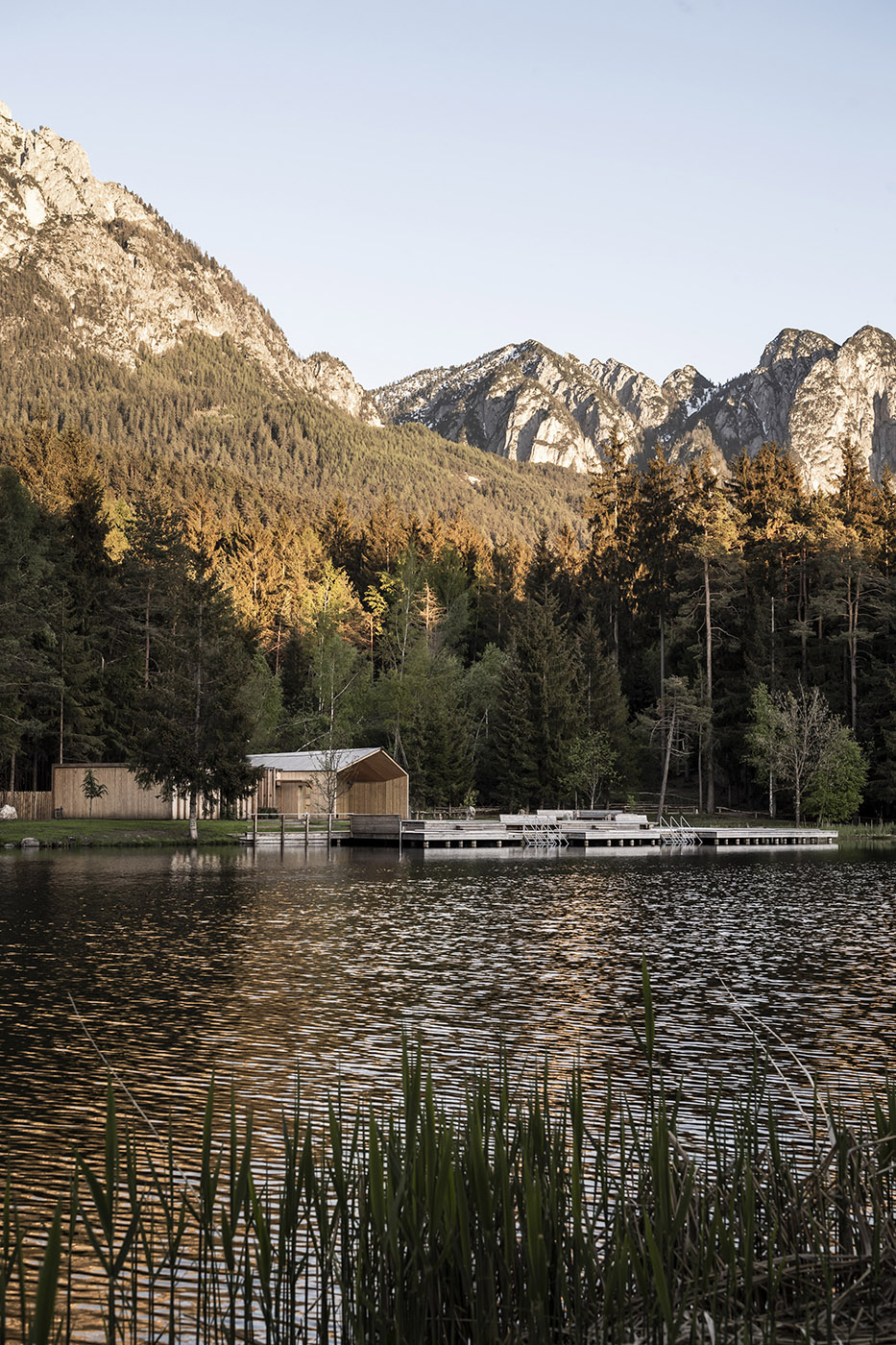 I pontili, di nuova costruzione, sono stati ricavati dal legname dei boschi attorno, sembrano ramificarsi nel lago. Dall'intero progetto traspare l'impegno dello studio noa* di gestire l'ambiente con cura e responsabilità, rimanendo, allo stesso tempo, fedele ai propri standard architettonici
