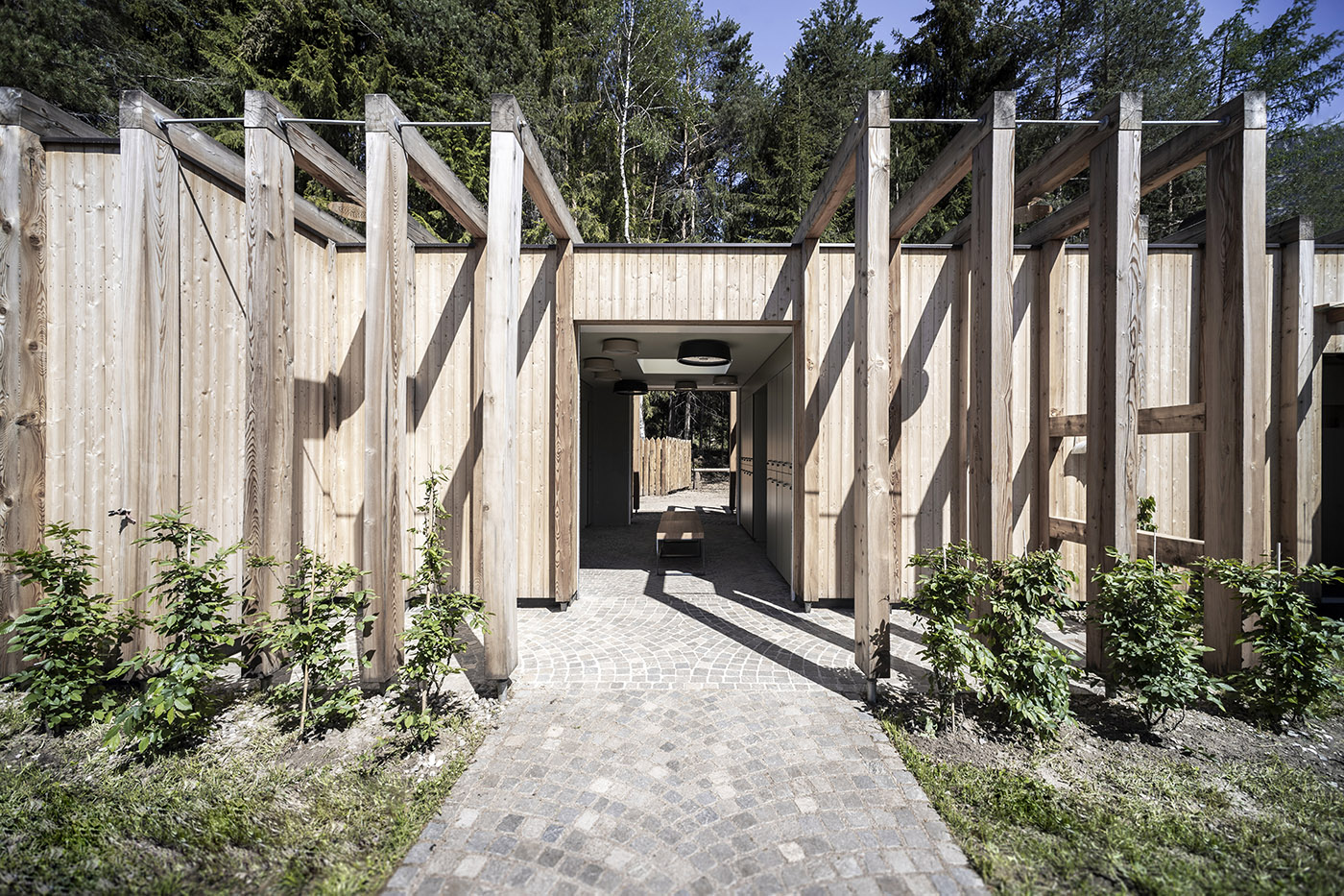 Il design degli spazi interni riflette la natura circostante, collegando interno ed esterno: il colore di base, che si ritrova su pavimenti, pareti e soffitti è il verde. L'architettura esterna è sobria, passa in secondo piano, lasciando più spazio alla vegetazione circostante. La facciata è in legno di larice, volutamente priva di trattamenti e lasciata al decorso del tempo