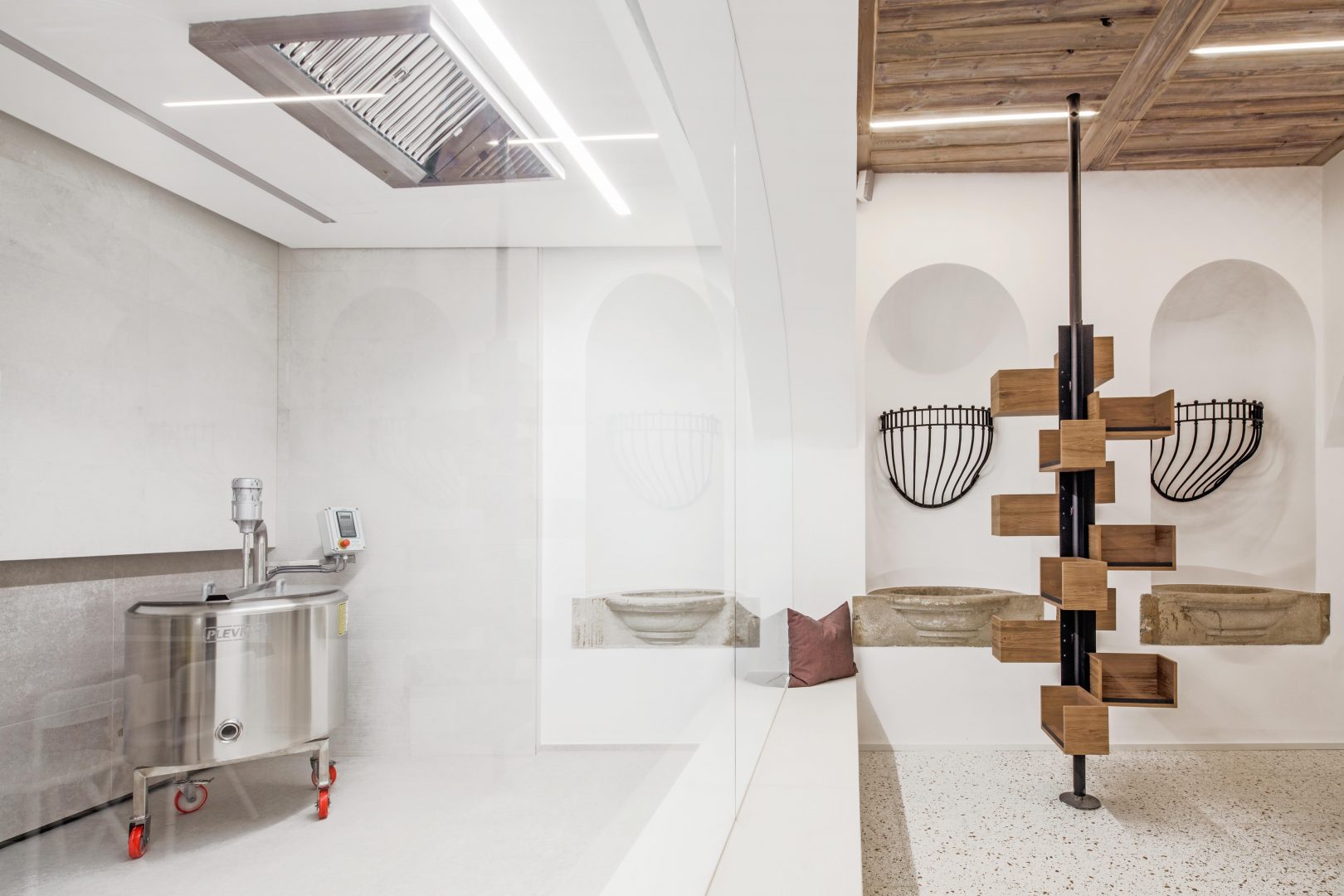 The cheese factory area has been separated from the rest of the room by a glass wall. The refined lighting reminiscent of a dramatic theatrical moment gives the process of making and selling the cheese the central role it was intended to play