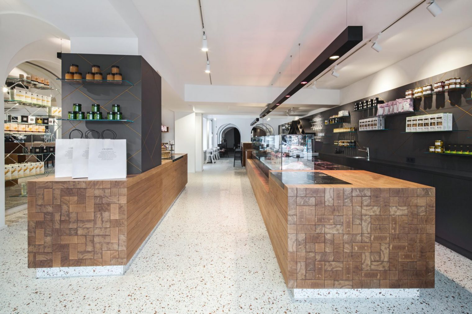 A cornerstone of the architectural concept was to give interior design a central role with Lingenhel diamonds. The control is from the pure abstract graphic model at the basis of the presentation of goods on the wall. Transposed into the third dimension, a shelf is developed for the presentation of wine