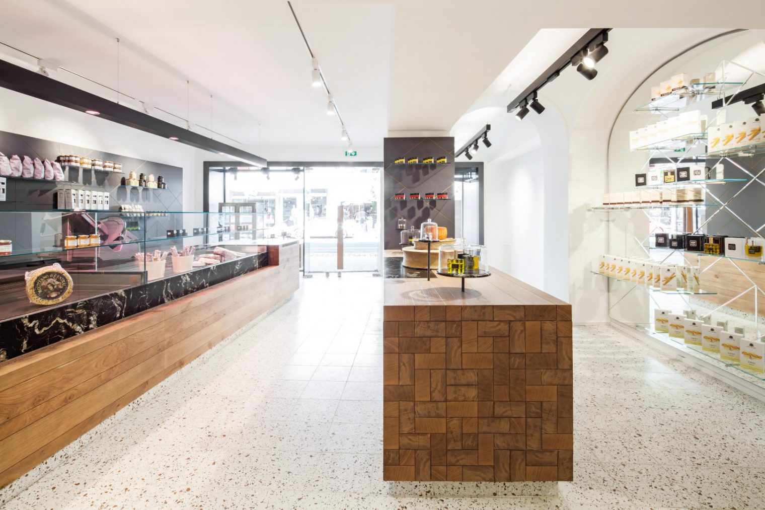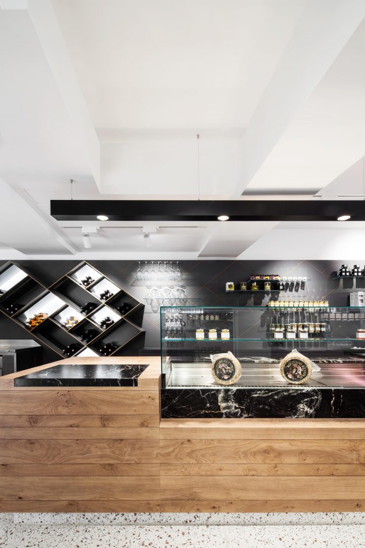 The beams of the historic roof structure inspired the emerged counters, bar and display furniture which resemble cubes superimposed on wooden beams. The surface structure and haptics play an essential role. They reflect through changes in coatings that develop over time. Both the long history of the house and the production processes of some food products find a place in the room