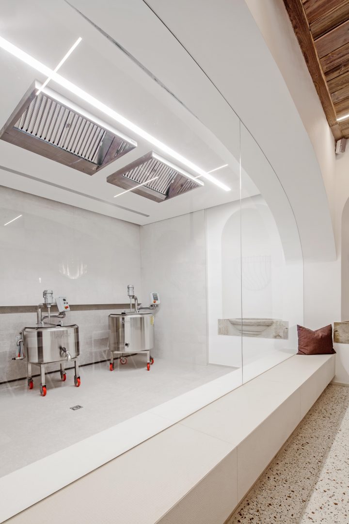 The pastry shop with a display area or a connected event space in the old court stables certainly represents a central area of undoubted charm. It was necessary to combine the hygienic requirements of a cheese factory with the demand for a harmonious and multifunctional event space