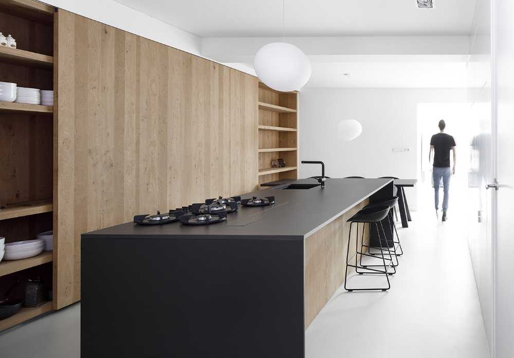 La cucina progettata su misura ha una grande porta scorrevole in legno per coprire la zona dispensa. Di fronte un'isola di cottura, che contesta con il suo nero assoluto. Gli armadietti incorporati e il camino sono realizzati con gli stessi materiali contrastanti per creare unità. Pareti di legno a tutta altezza, con porte integrate, formano l'ingresso alle aree più private come camere da letto e bagni. Per una luce ancora più naturale, è stato creato un patio tra il soggiorno e la camera da letto principale