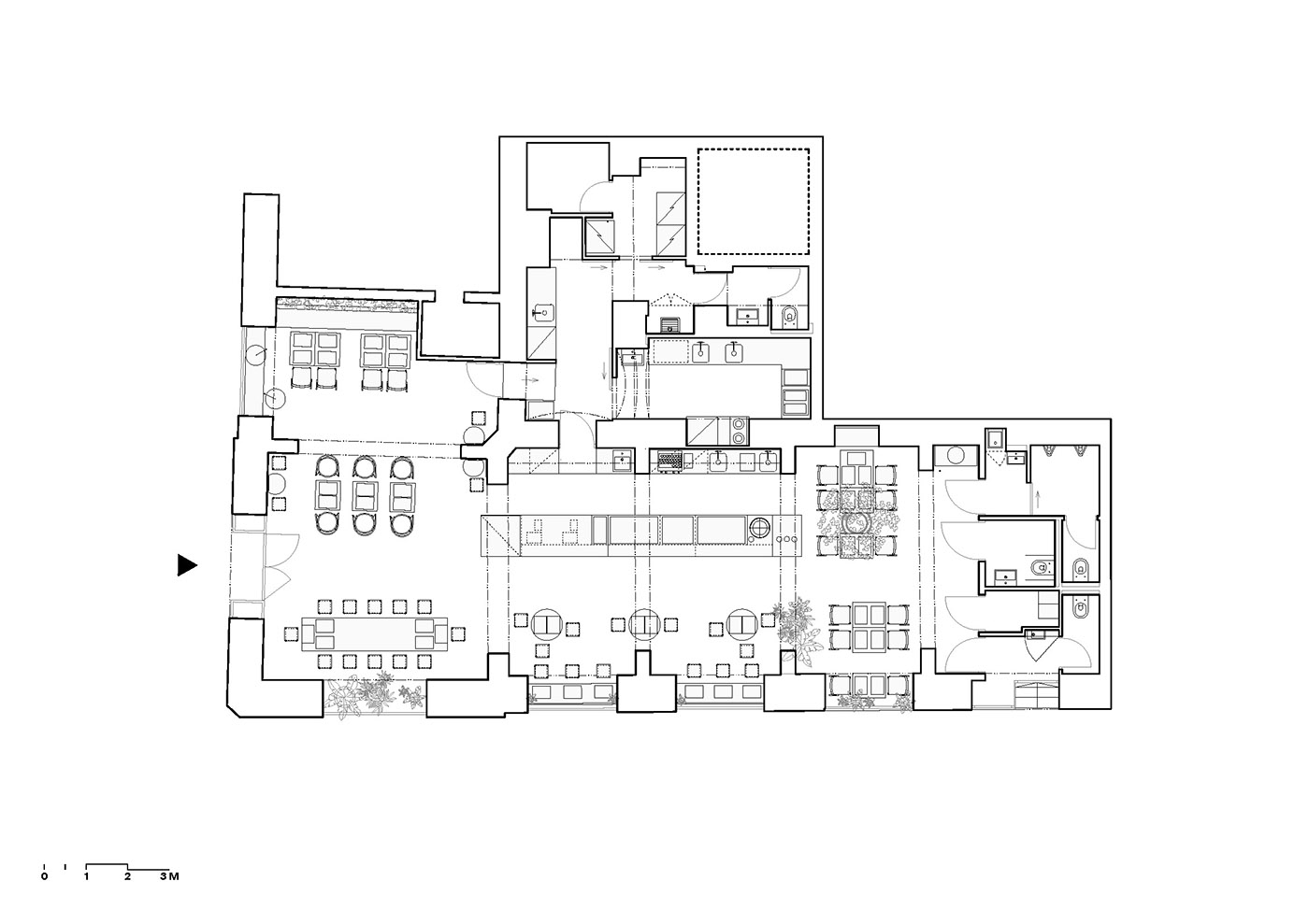 The ground floor of the historic corner building that is home to the new Loving Bistro has housed businesses served by large storefronts since its construction by architect and builder František Leypold. The originally all separate stores underwent gradual modifications over time, with gradual mergers through a pattern of portals that pierced the load-bearing walls. The renovation project to settle the bistro included moving the kitchen deep into the floor plan, allowing the portals to be widened and the floor level previously distributed over several levels. The original aluminum frames of the storefronts, although not perfect, were preserved with minimal intervention. The architects' philosophy holds that it is not always necessary to change everything.
