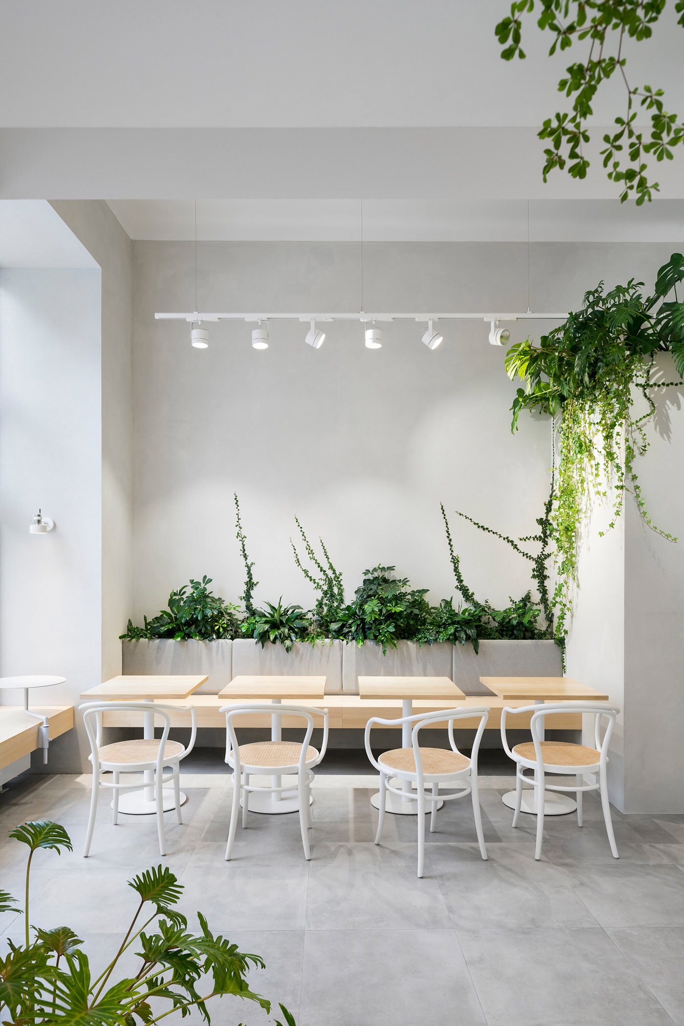 Clean, minimalist surfaces were deliberately used in the design of the Loving Bistro as a neutral backdrop to enhance the colors of the food, people, and events taking place inside. The space is dominated by a wooden self-service counter with a glazed refrigerated display case and the necessary gastronomic equipment. The main view, framed by four regular doorways, is enclosed by a wall of wooden slats with retractable doors. Other ash wood elements were custom made, coloring the interior with a combination of light gray finishes, Lasure cladding and ceramic mosaics. Everything is connected by the purity of white-painted walls and splashes of green indoor plants