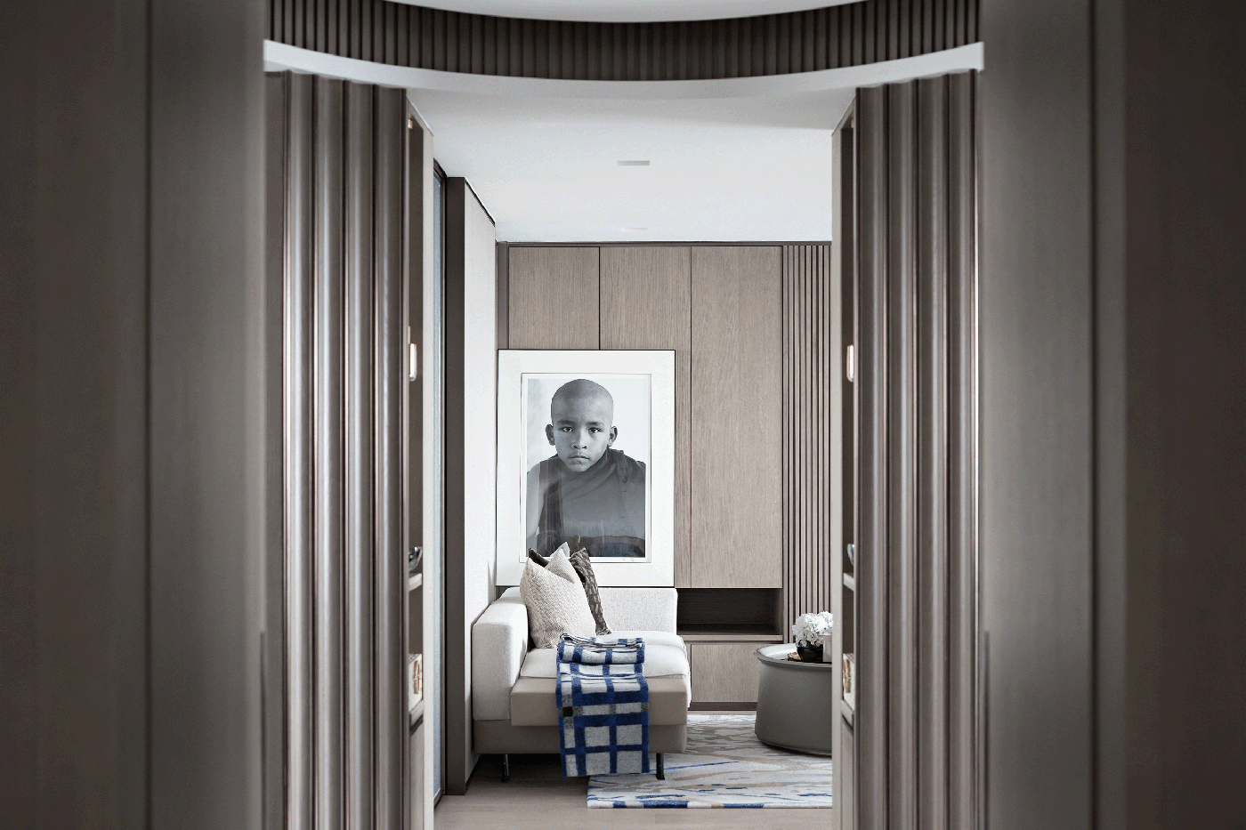 Un dispimegno circolare porta alla cabina armadio, allo studio e alla camera da letto principale che sono collegati in linea. La distribuzione degli spazi accuratamente progettata rende ogni area funzionale indipendente e connessa, rendendo la casa un luogo conviviale in cui si può avere comunque la propria privacy, ma anche momenti di raccolta, romanticismo e calore.