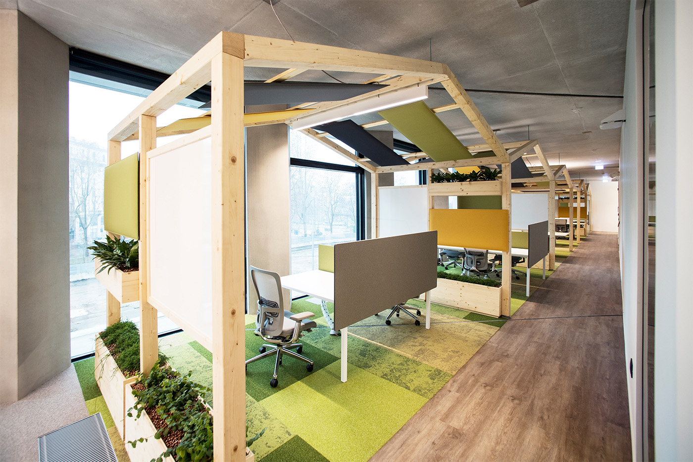For tasks that require particular concentration, "Smart Platforms" have been created, workstations located inside metal structures and enclosed by acoustic panels and sliding boards. For collaboration and brainstorming activities, "Creative Gardens" have been created, high-performance acoustic zones made easily recognizable by the wooden structures that frame them and by the presence of greenery and plants.