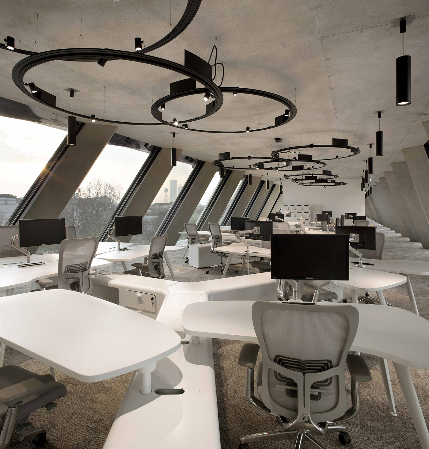 On the operational floors, the workstations not assigned to Open Space differ in form and aesthetics, according to functions and needs. A particular design of the clusters, finishes, furnishings and floors helps to differentiate the types of work carried out in the various areas of operation. Different elements create sub-areas to reconcile the transparency of the spaces with an excellent acoustic and environmental performance.