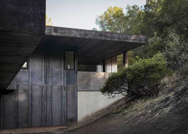 The project began as the renovation of a 1954 ranch at the foot of a hill. The structure and the land turned out to be unsuitable, so the management of the project changed and decided to rebuild the house almost entirely from scratch. The only surviving part of the original structure is the chimney, which was covered with concrete and used for structural support