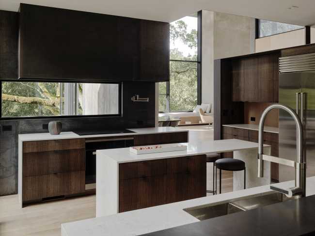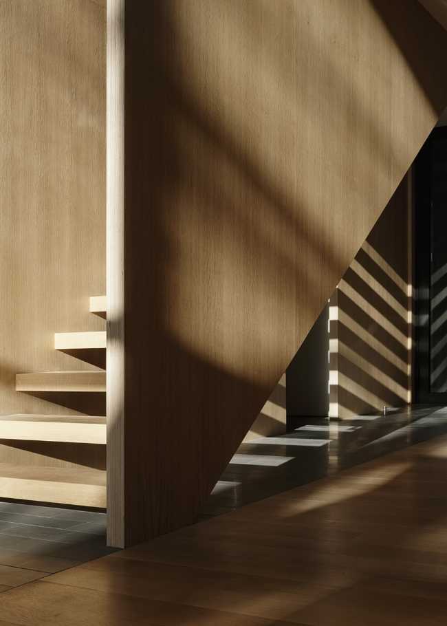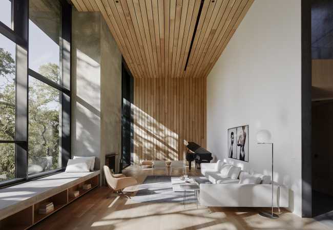 The entrance to the 3,725 square metre house is to the north, where a covered walkway made of sheet steel leads to the front door. Inside, the large windows provide visual continuity with the landscape. A 3.6 metre high retractable glass wall opens onto a patio and the adjacent garden