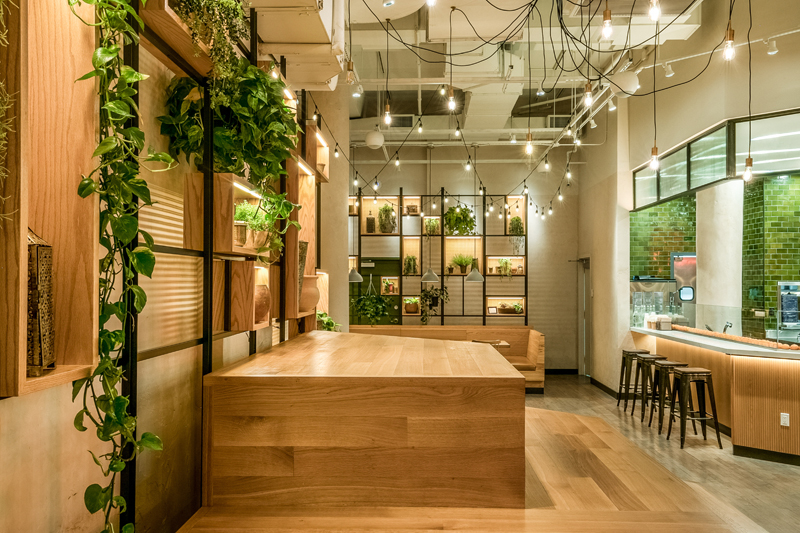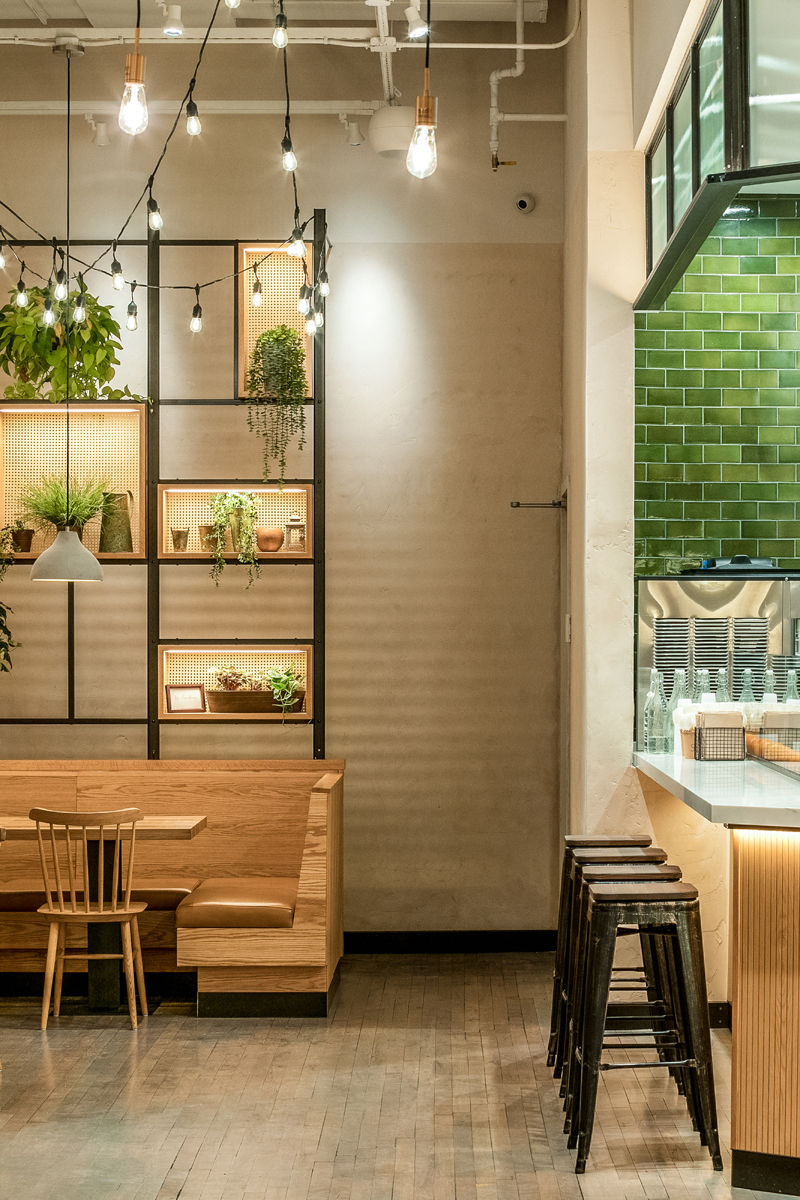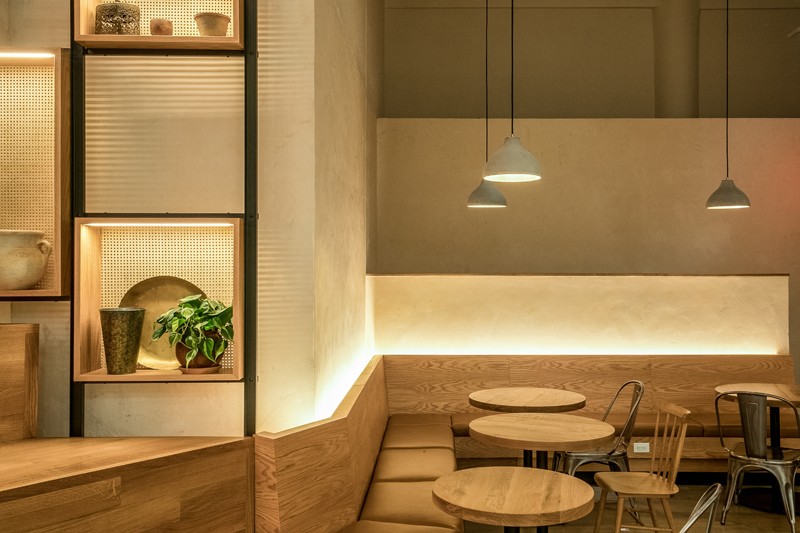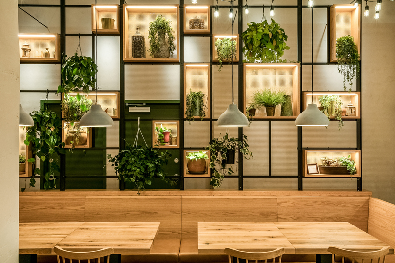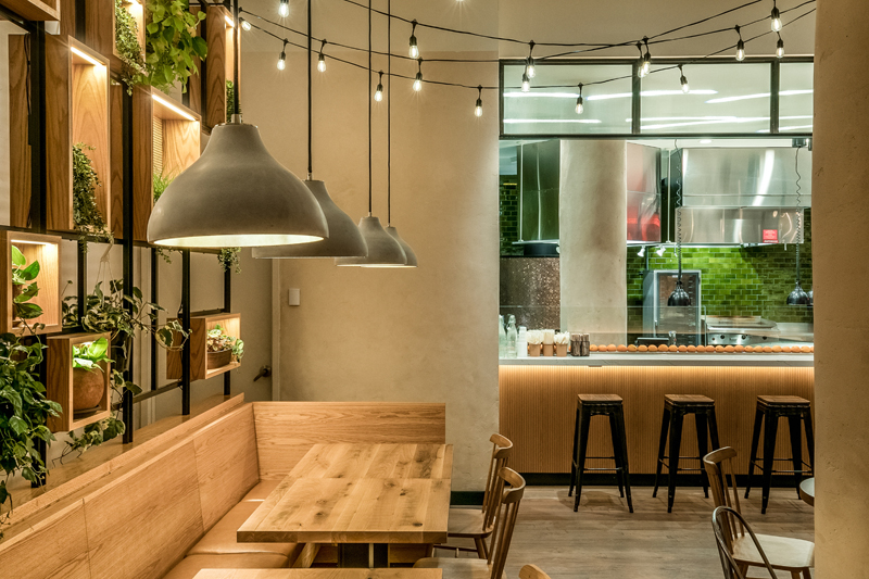 Casual wooden interior for an Israeli restaurant. Fresh greys and natural greens