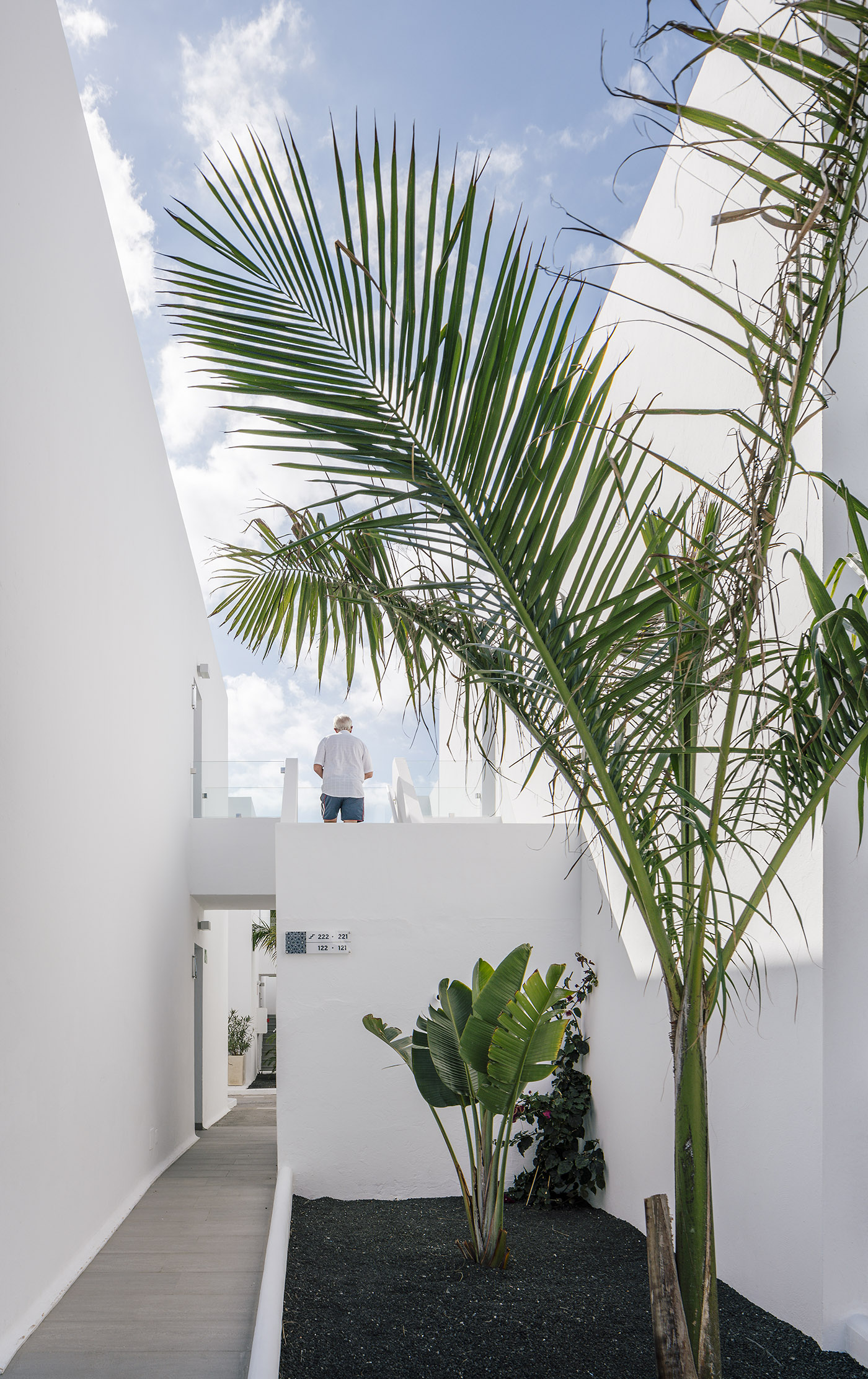 Small white houses with blue additions to create the relaxing sensation of a small village; the neat and essential volumes restore formal purity and let the sky and the sun of Lanzarote play the leading role in this hotel complex in the central-eastern part of the island