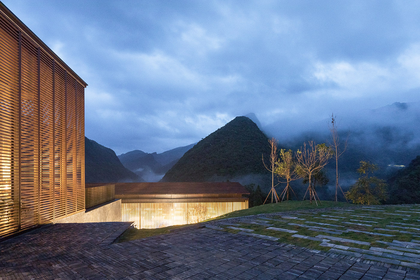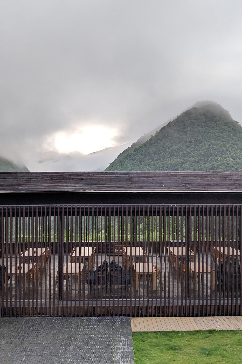 A combination of glass and vertical shutters for the façade of the restaurant, where the main entrance is located, introduces soft natural light into the space, maintaining the feeling of being immersed in the mountain scene. Vertical louvers on the valley side are folded along the folding frames and can be opened fully when desired, thus encompassing the high mountains and giving the room a different atmosphere depending on the climate and season