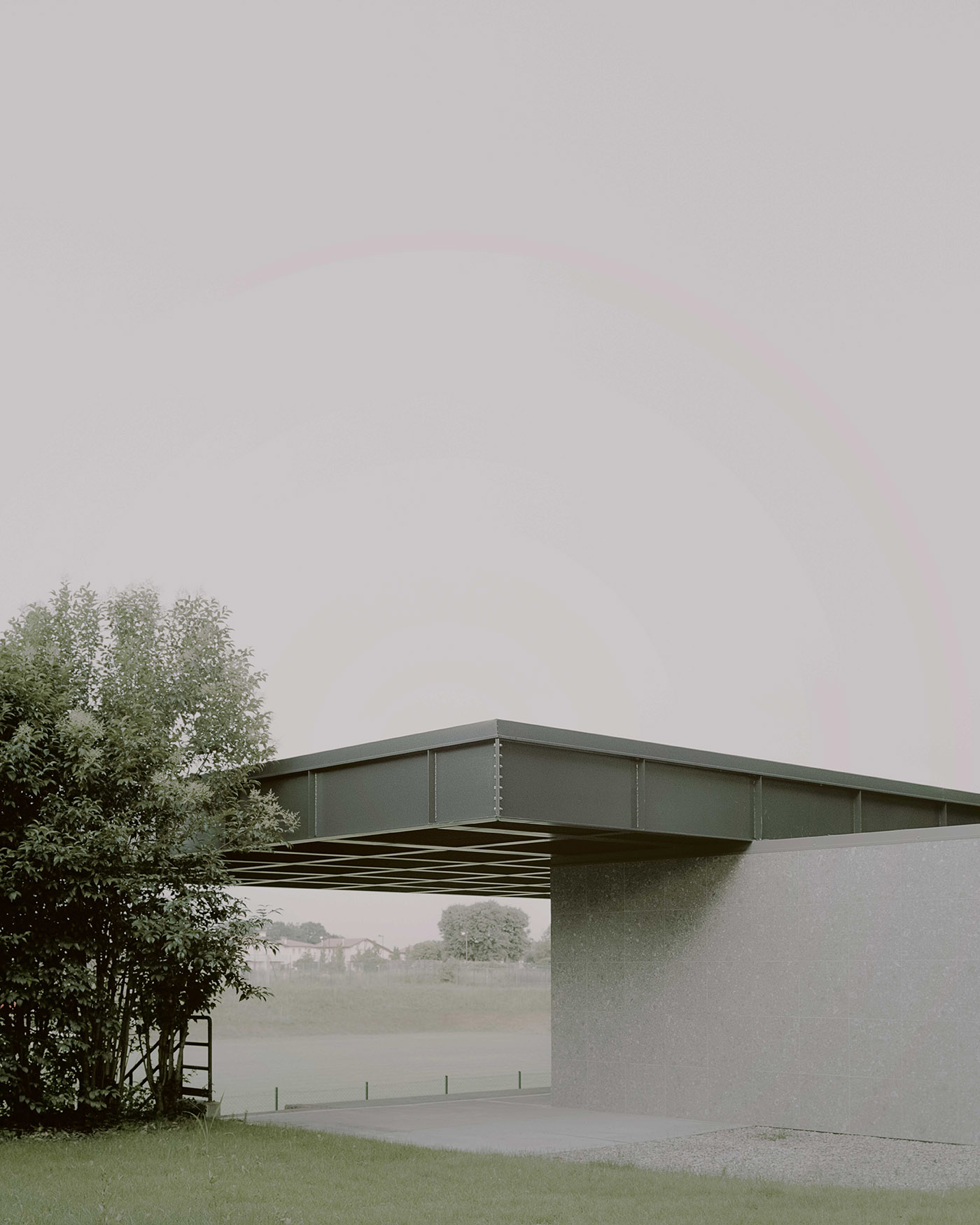 The volumes of the reinforced concrete basement are clad in stoneware; the roof is composed of steel beams painted in a dark color so as to visually lighten the cantilevered element; the roof covering is made of sandwich panels. To complete the intervention, a new concrete pavement was constructed