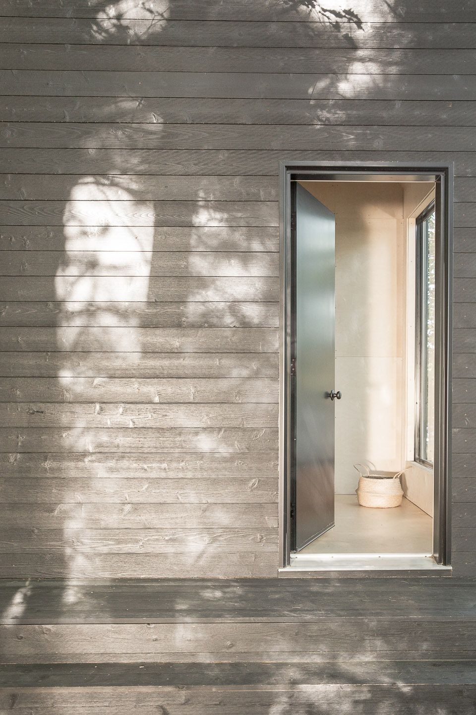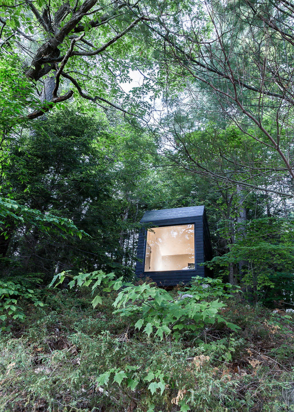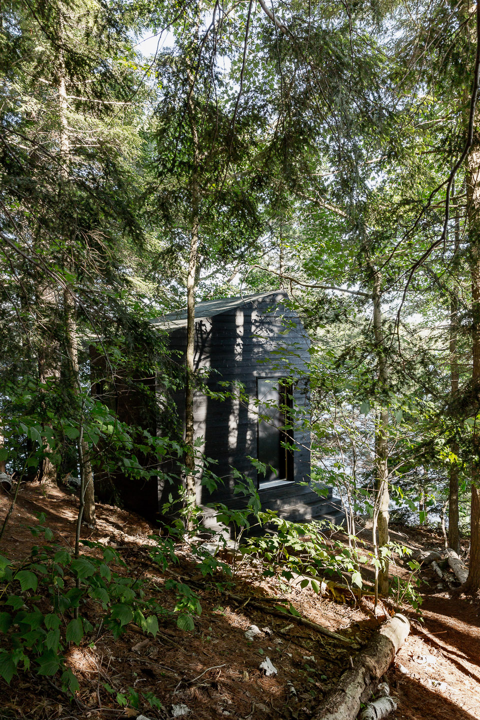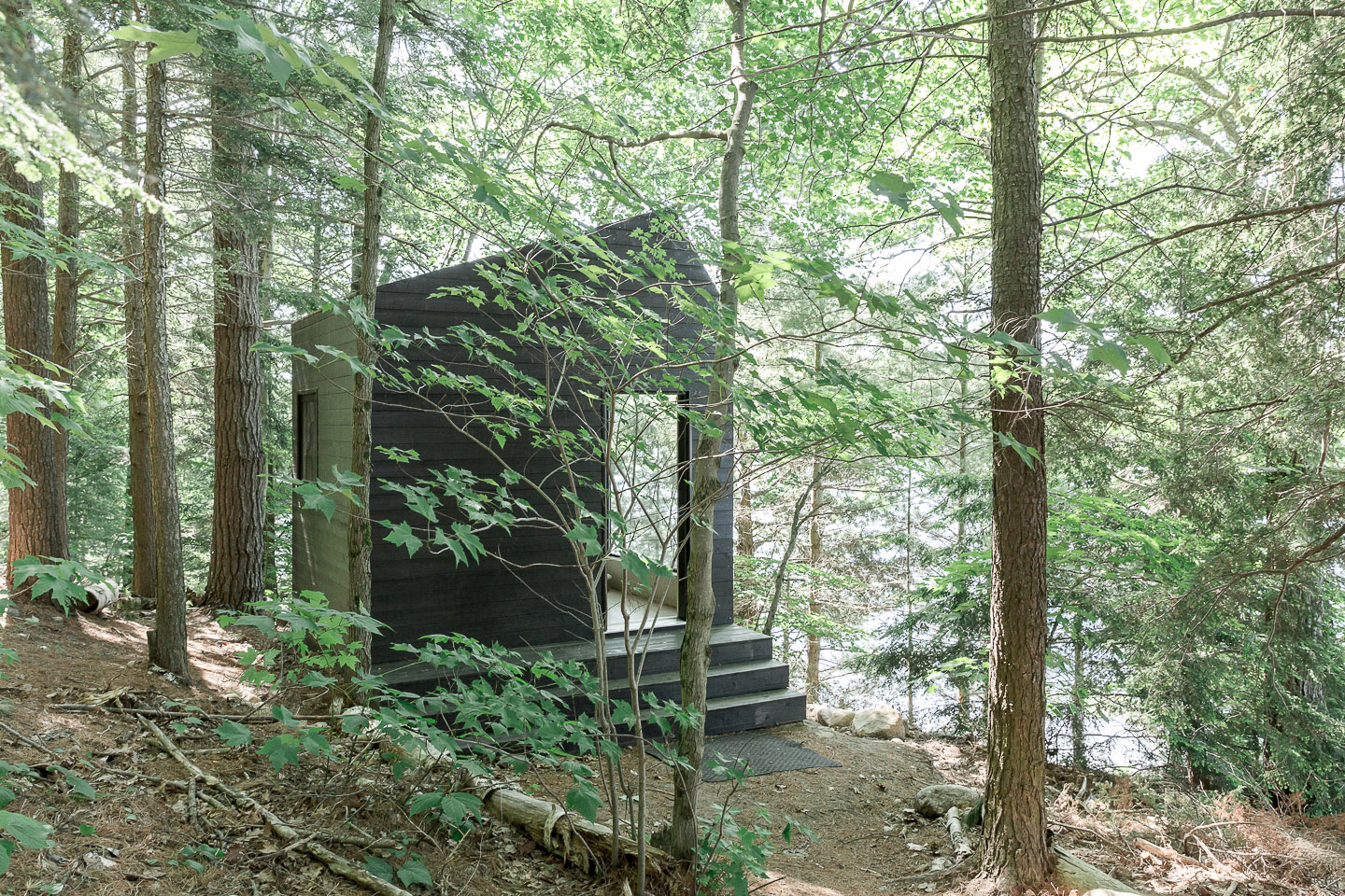 The Craft&Bloom studio was commissioned to build a cabin perched in a pine forest, a few steps from the beach, in Muskoka, Canada. The result is a dark wood cabin with chameleon-like charm