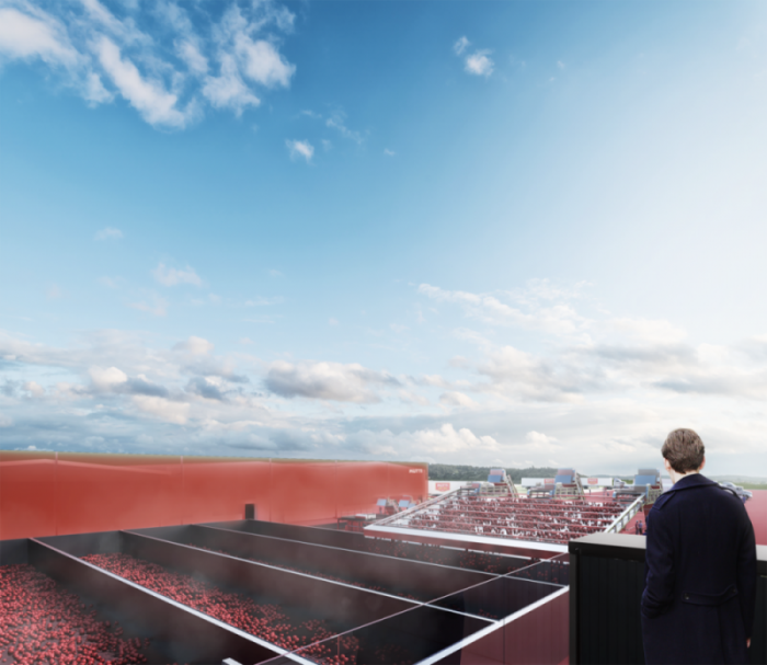 At the top of the visitor centre, people can access a public terrace, from which they can view the first stage of food processing. Freshly harvested vegetables are poured into the washbasins in tons, allowing visitors to admire the sight of millions of tomatoes falling into an endless "red waterfall"