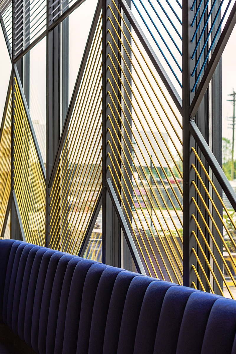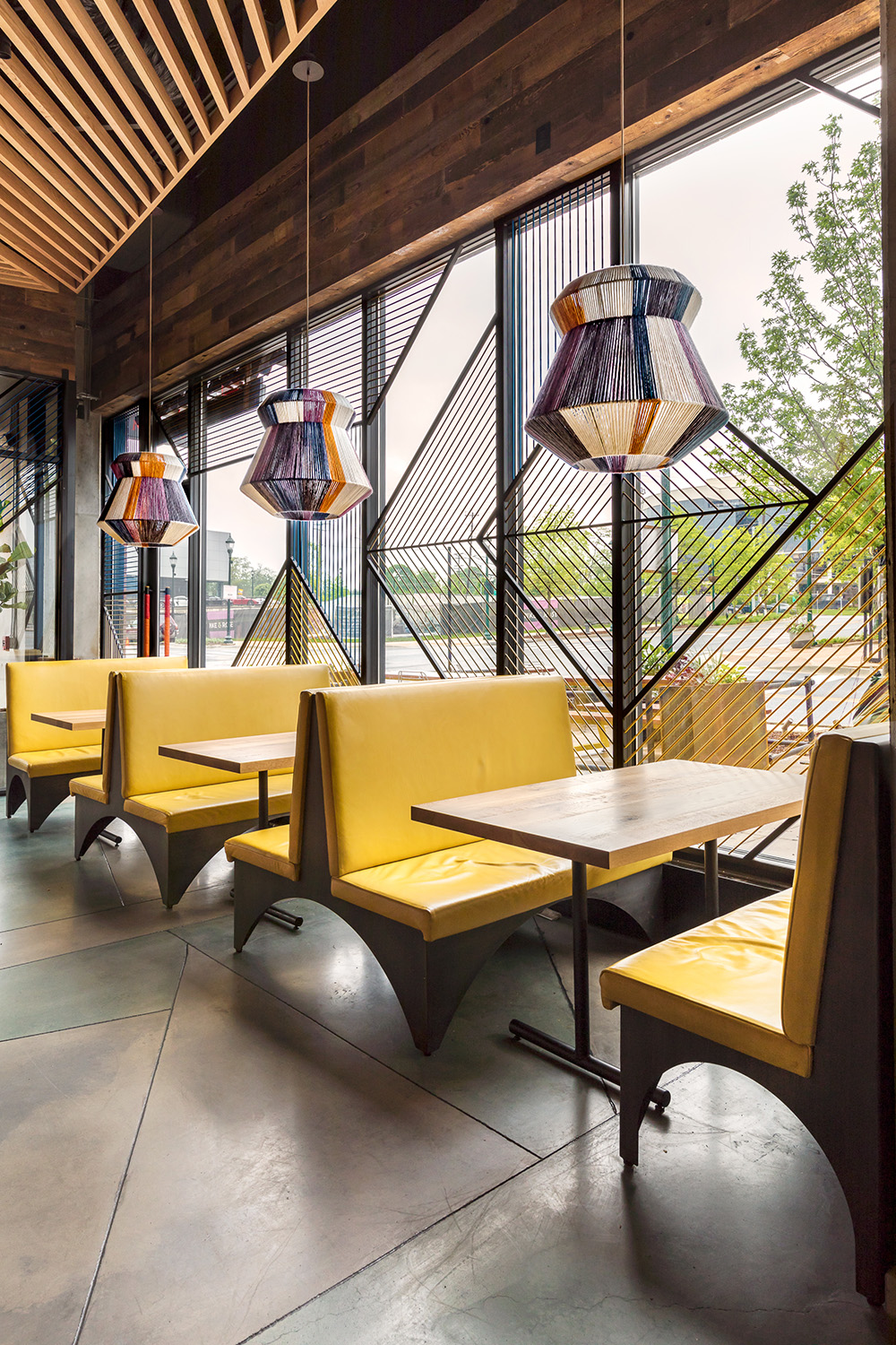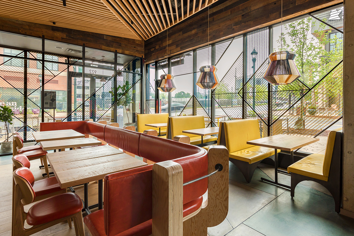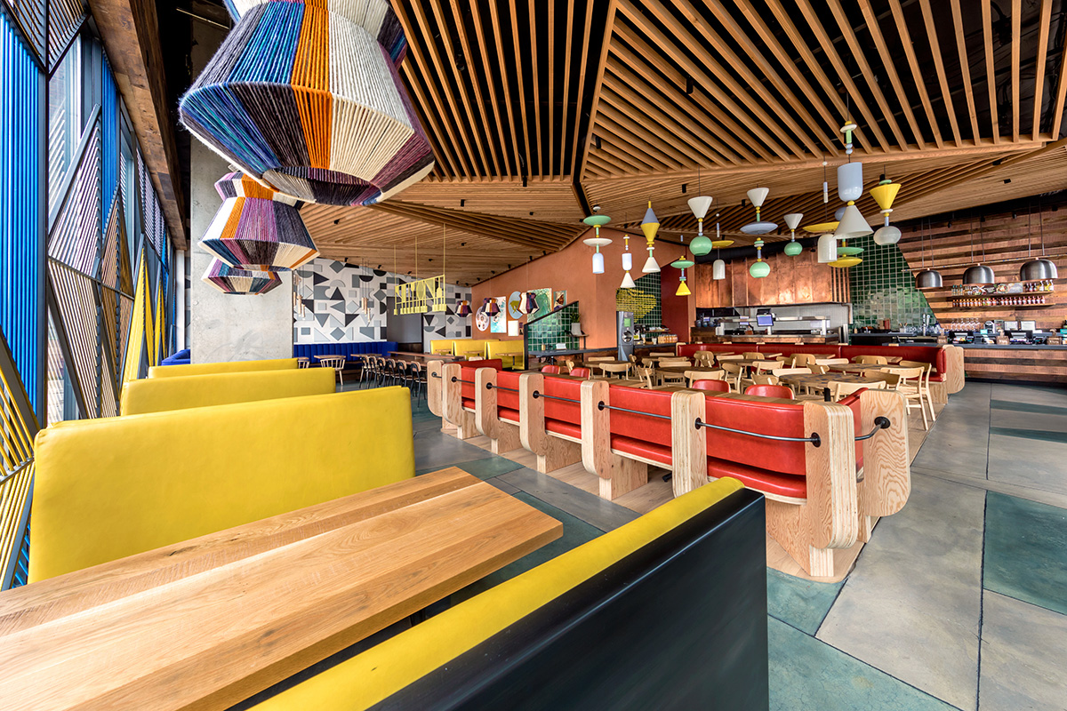 In Washington, the Crème studio is responsible for the designing of a restaurant, with the most varied combinations of geometries, textures, lines and colours that create a fun and inviting atmosphere, with references to the vivacity of South African textile heritage