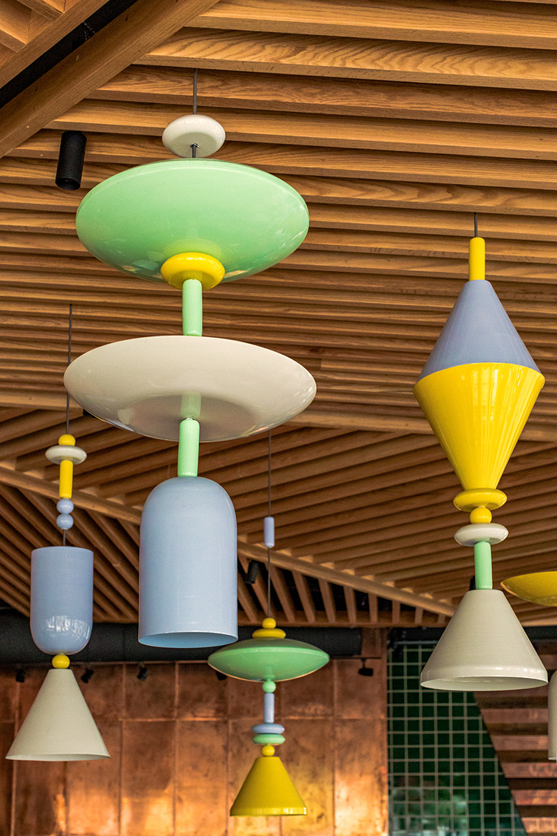 The design of the restaurant due to its particularity invites visitors inside, where they are welcomed by a solid wood canopy floating on the dining room. Behind the counter, a wooden cladding alternates with perforated copper, followed by green glazed tiles