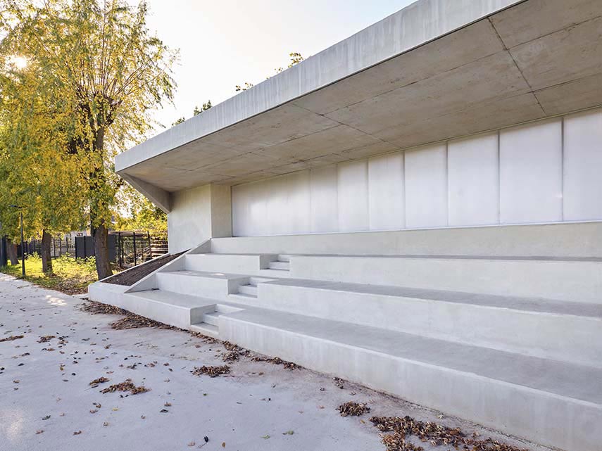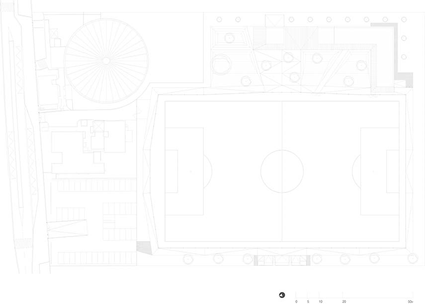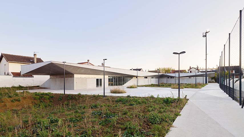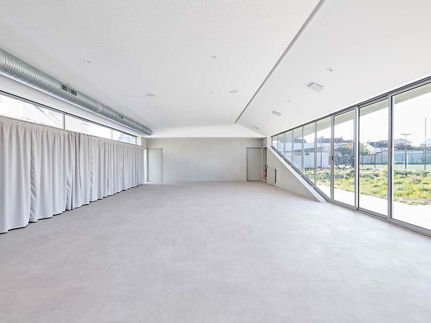 Among the various architecture projects signed by Schemaa, in 2021 the construction of the new sports facility at the Bondy stadium was completed, located in the southeast corner of the lot and its program included a multi-purpose hall, a locker room, the grandstand, a new synthetic field, and the arrangement of some outdoor areas