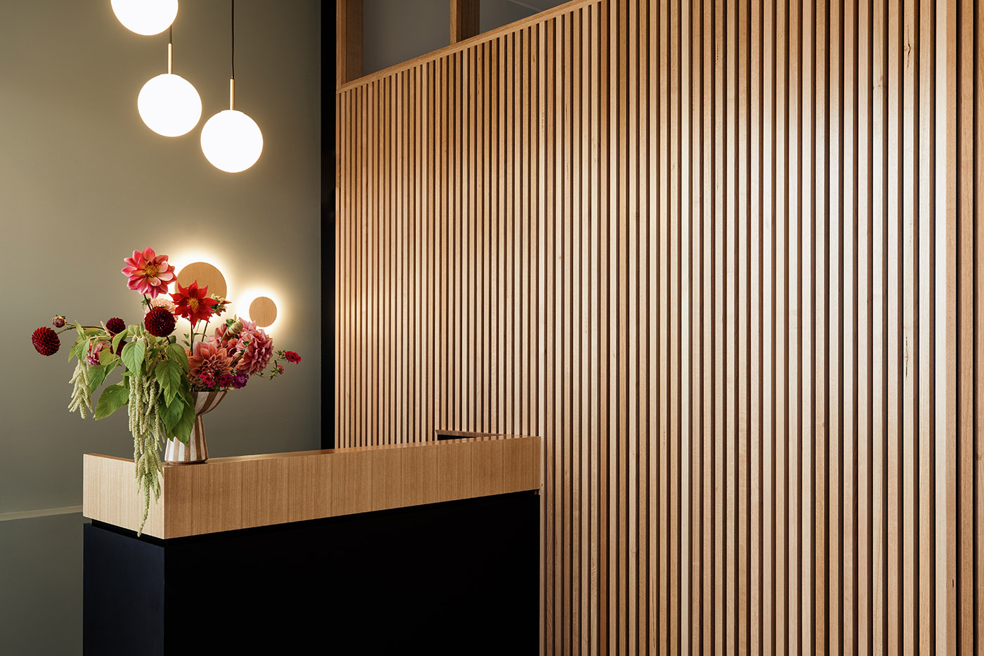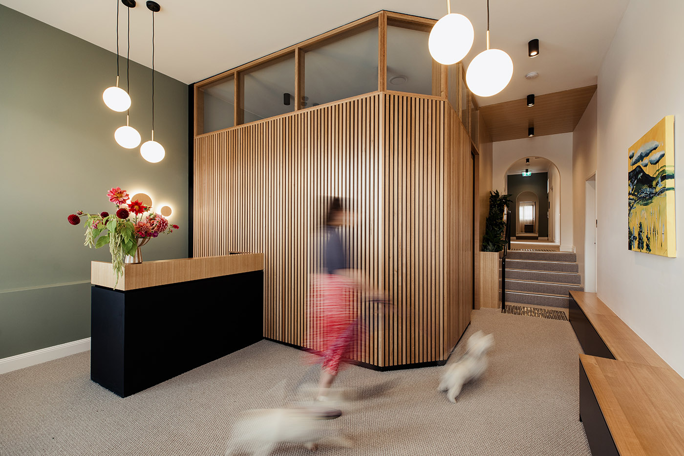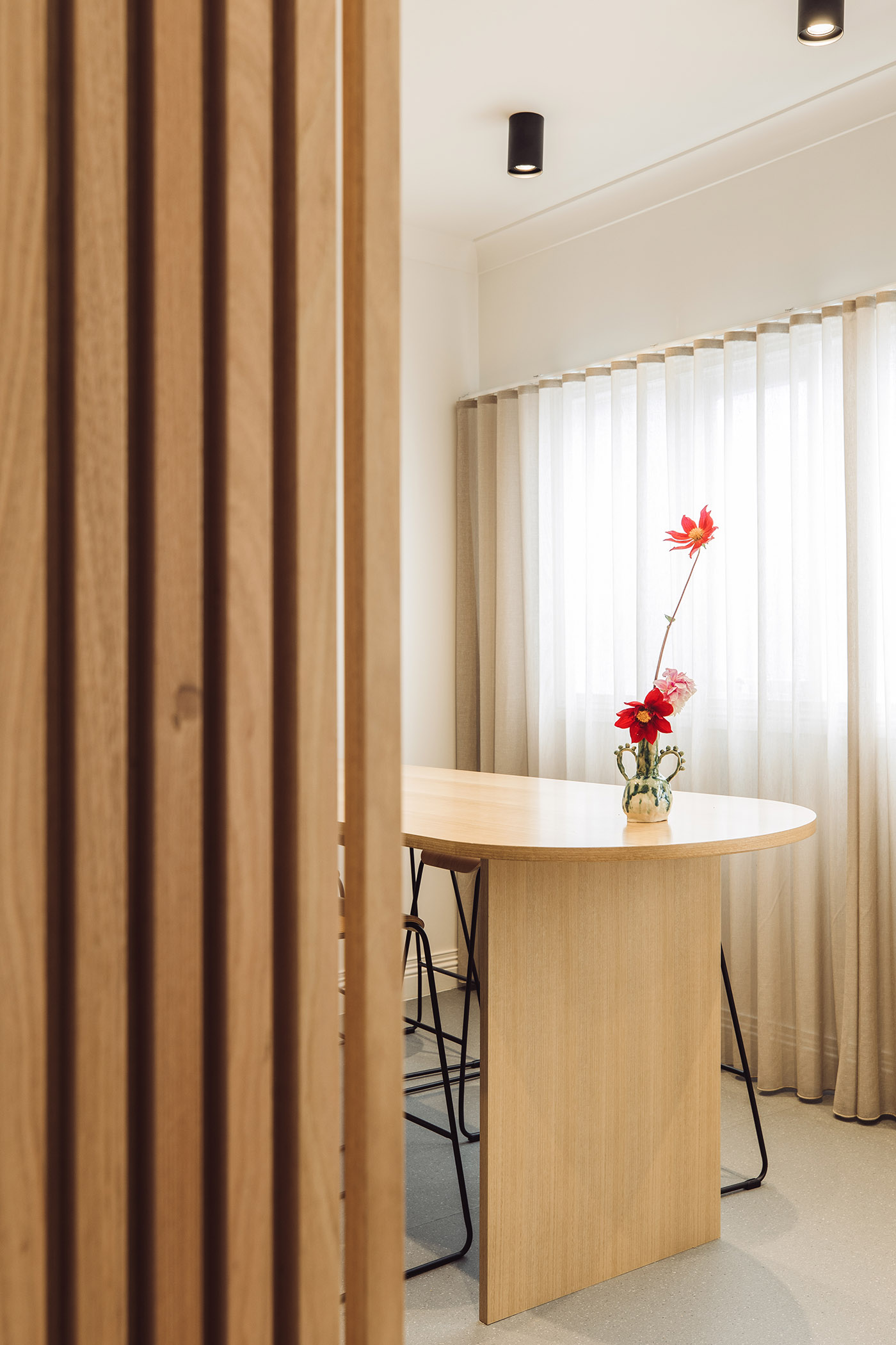 Tasmanian oak wood, which has a particular way of wearing out, brings natural warmth and informality. We find it in several applications within the practice: wood slats at the reception create a texture of light and shadow; it also wraps around threshold spaces, transitioning to solid paneling in the counseling rooms and minimal treatment in the back of the building
