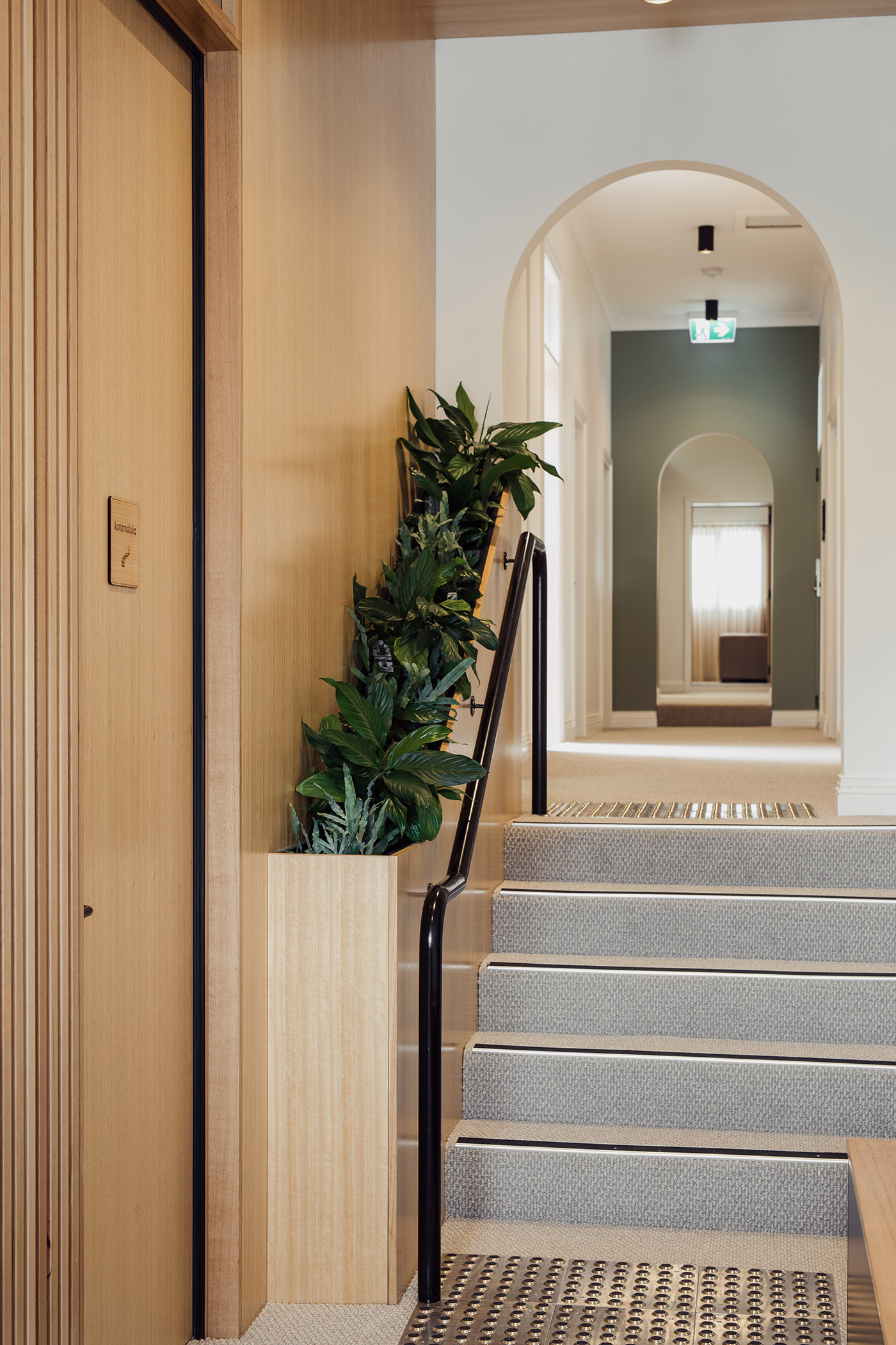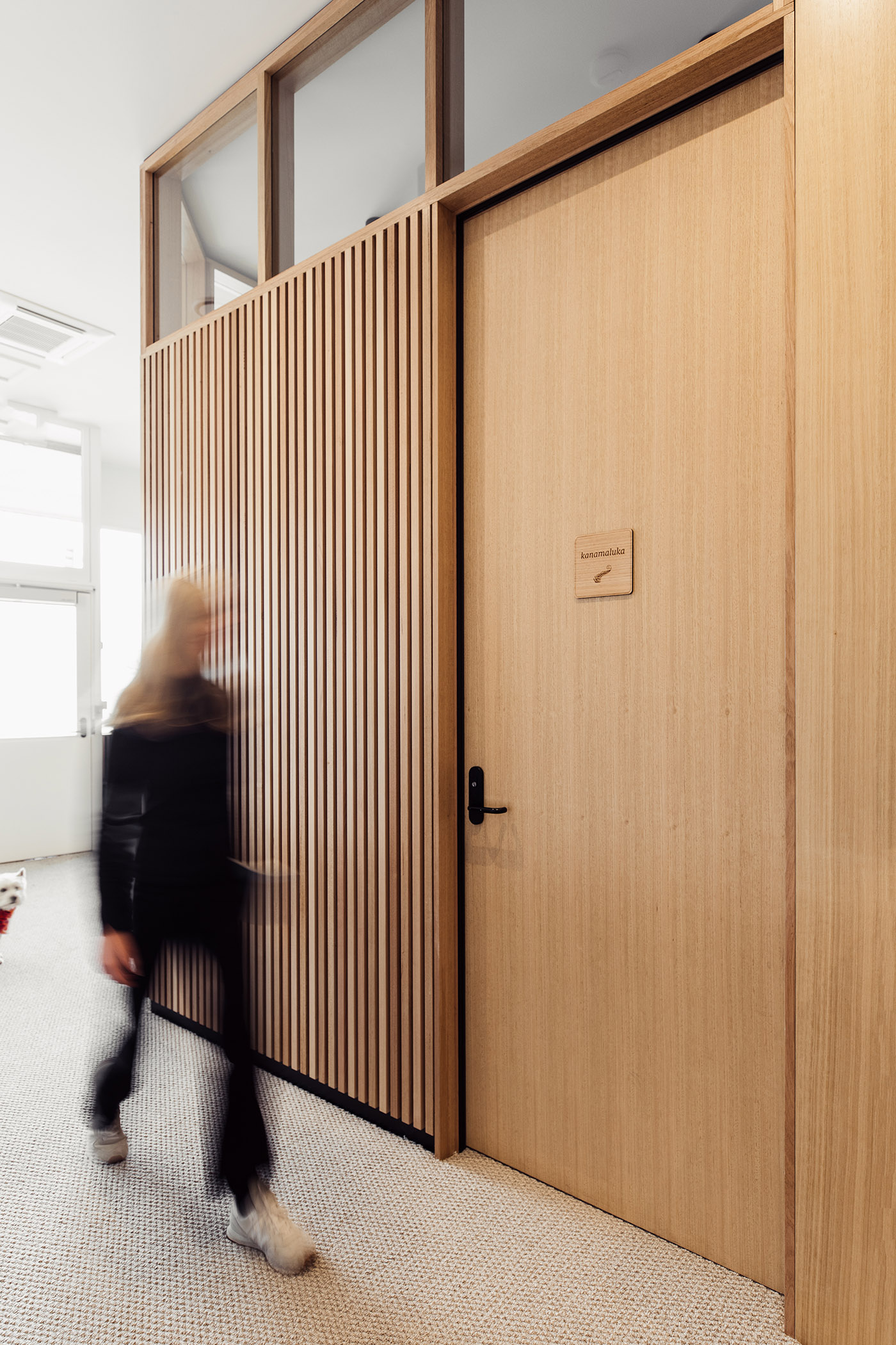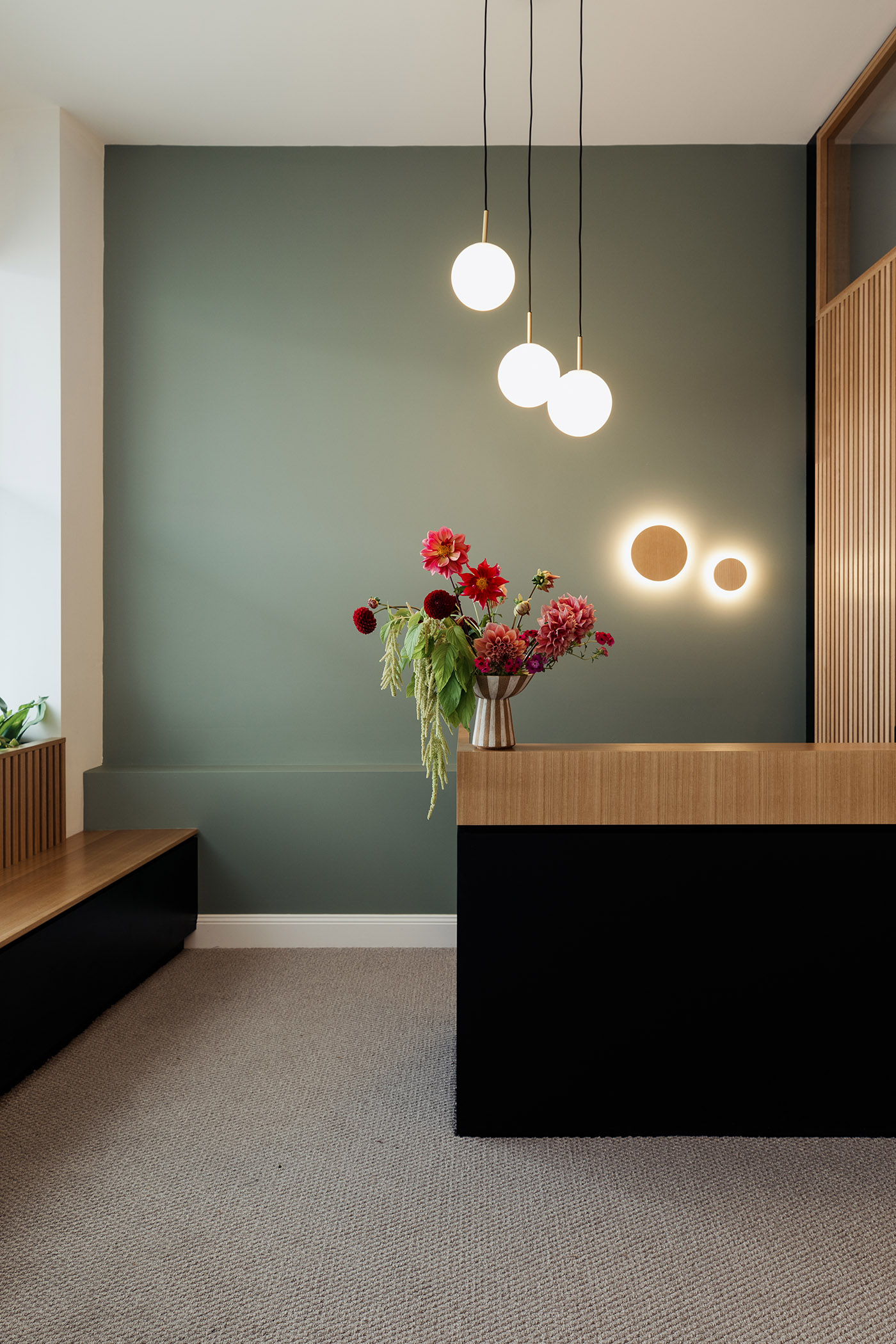 Tasmanian oak wood, which has a particular way of wearing out, brings natural warmth and informality. We find it in several applications within the practice: wood slats at the reception create a texture of light and shadow; it also wraps around threshold spaces, transitioning to solid paneling in the counseling rooms and minimal treatment in the back of the building