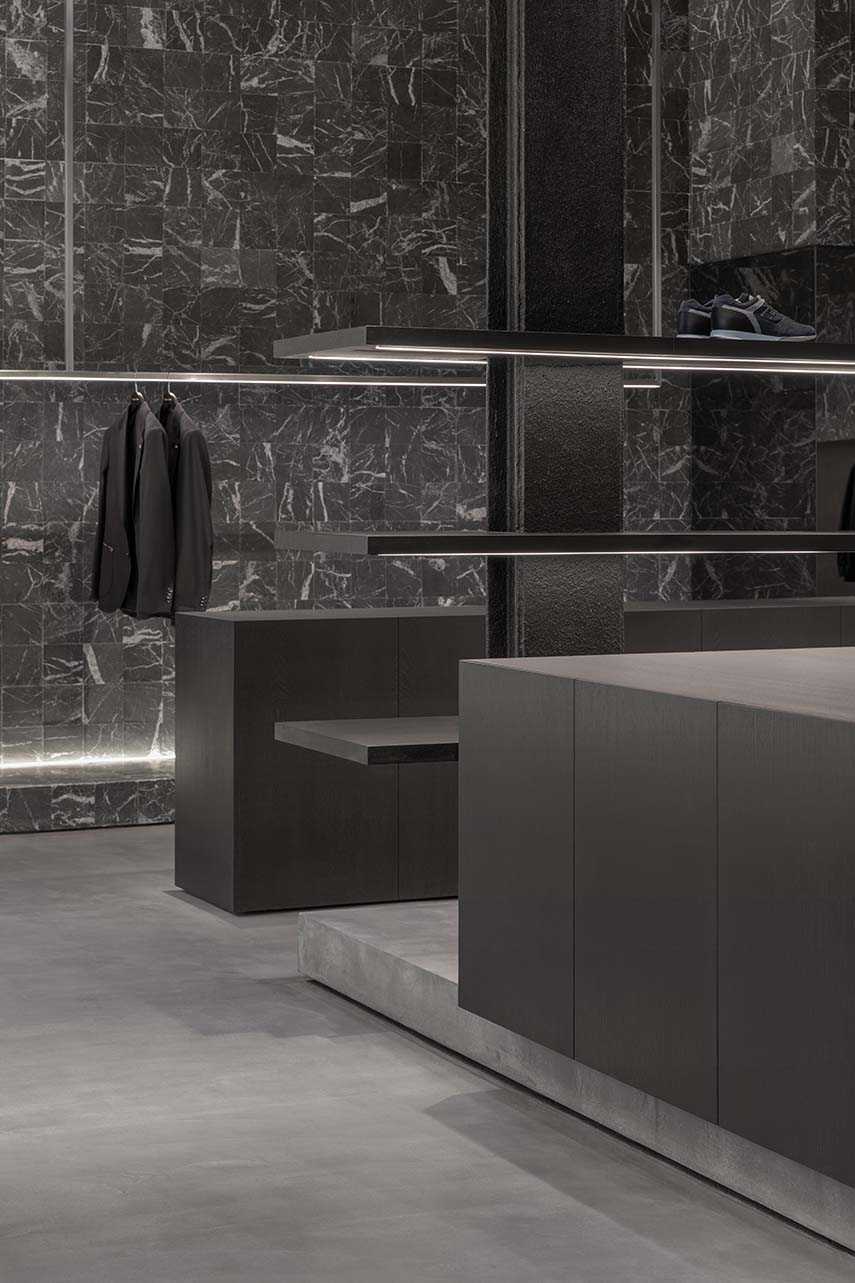In contrast, Marquina marble, with its natural veins, maintains a connection with tradition and the sophisticated style that has always defined the brand's identity. Marble tiles decorate the floor creating an effect reminiscent of a large abstract artwork, adding a unique visual component to the project.