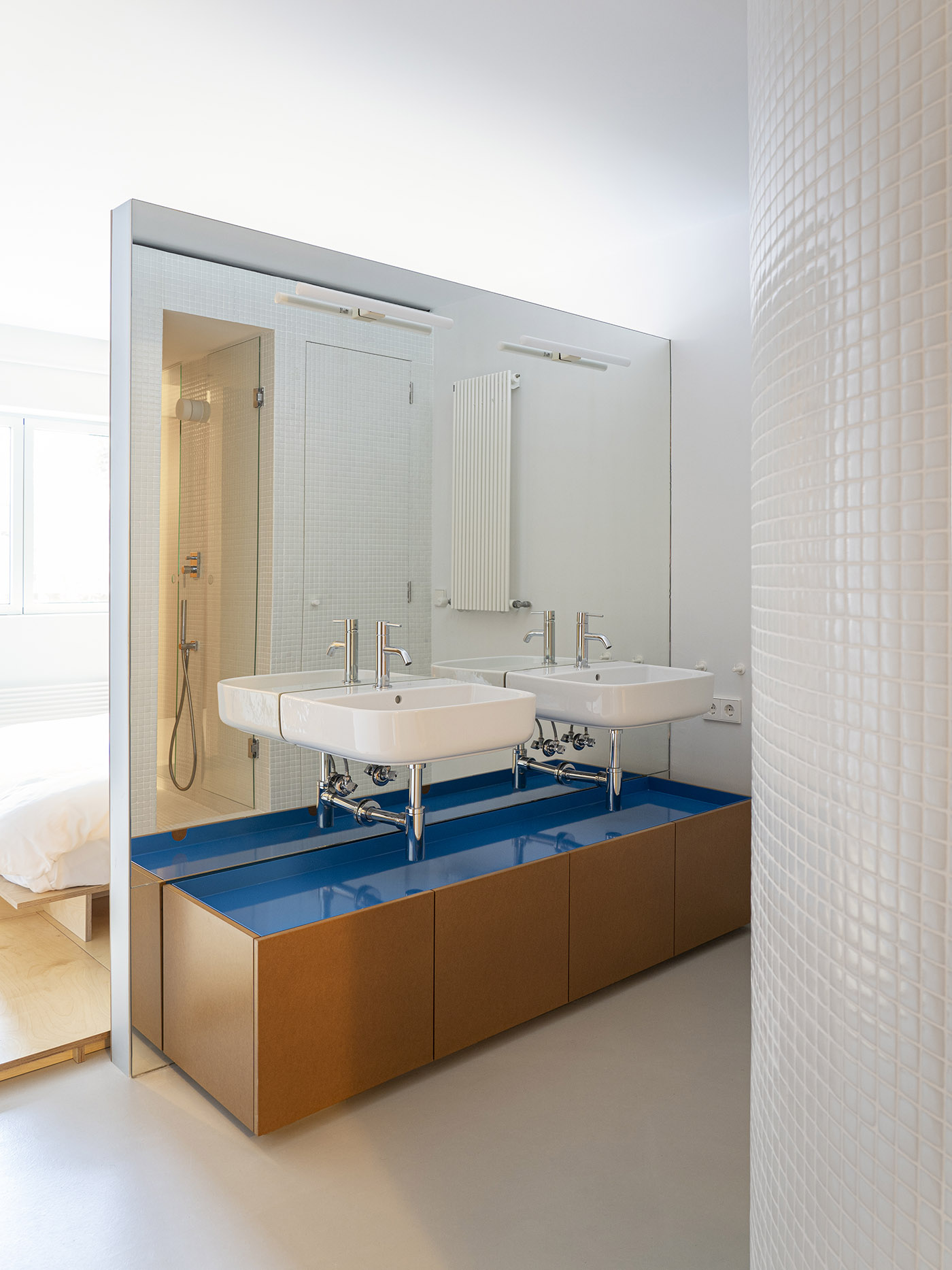The wooden elements, on the other hand, rest on the pre-existing floors, which have been treated to lose their surface coatings, recovering a raw, structural character. The most intimate areas of the house, bedrooms and living room, are provided with plywood platforms, slightly raised, supported on wood slats