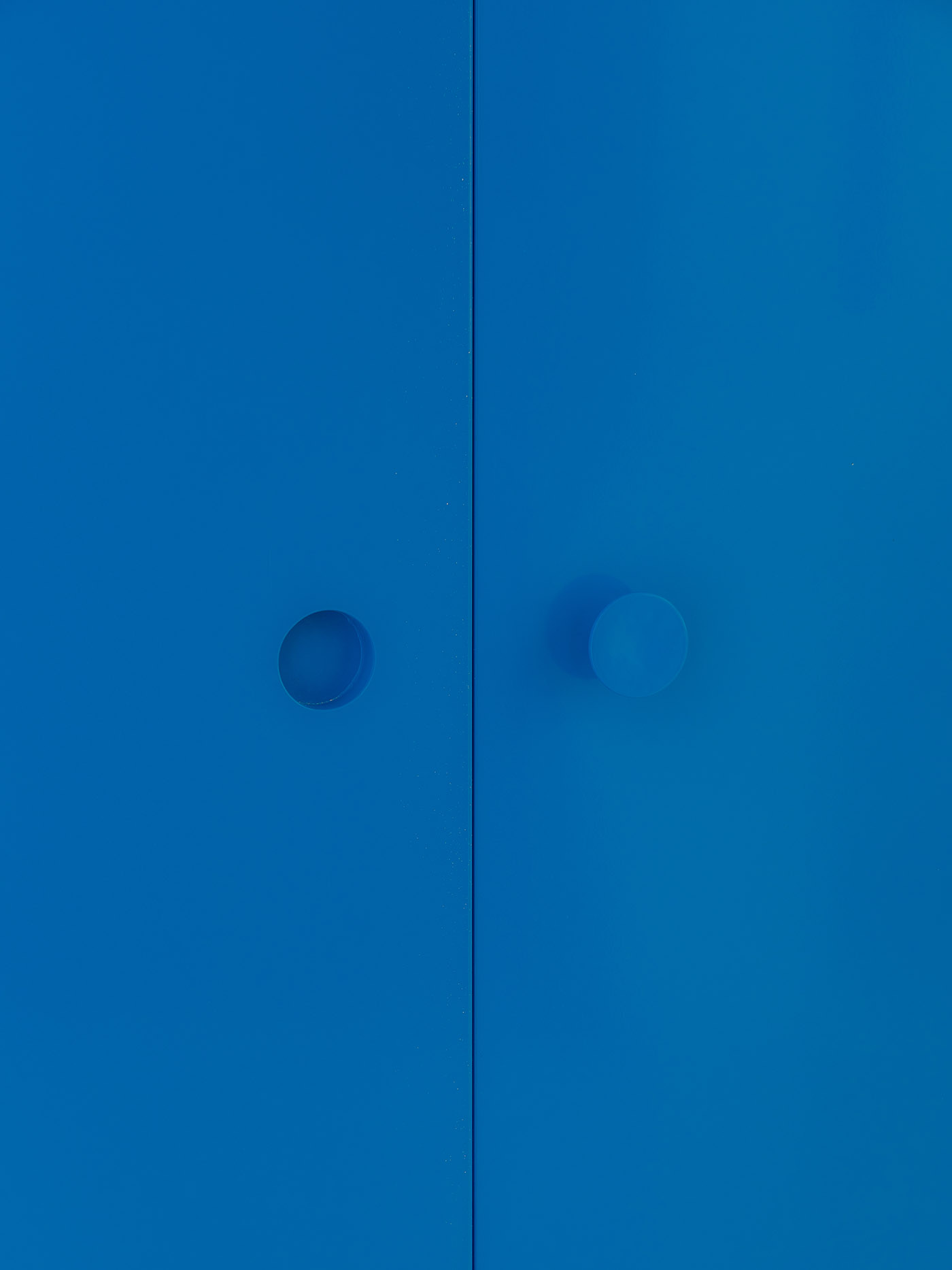 The objects that enrich the project are divided into two large families, which are distinguished by their material content: wood or metal. The blue painted metal elements hang structurally on the walls, without touching the ground. The main element is a "T"-shaped metal bookcase placed in the center of the house, suspended a few cm from the ground, suspended between the load-bearing walls of the building