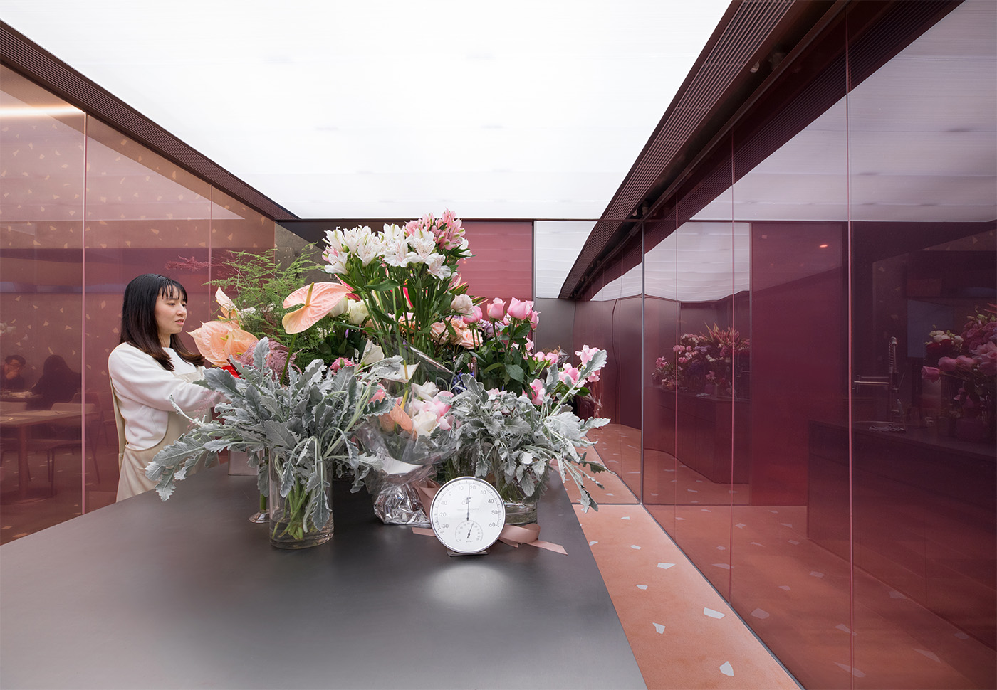 Customers are encouraged to pass through a transparent cube, a translucent box that serves as both a street background and a restaurant background. The border between the floral shop and the outside world is represented by a large transparent stained glass window that reveals the floral activity.