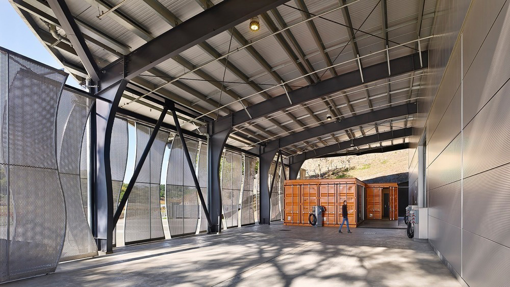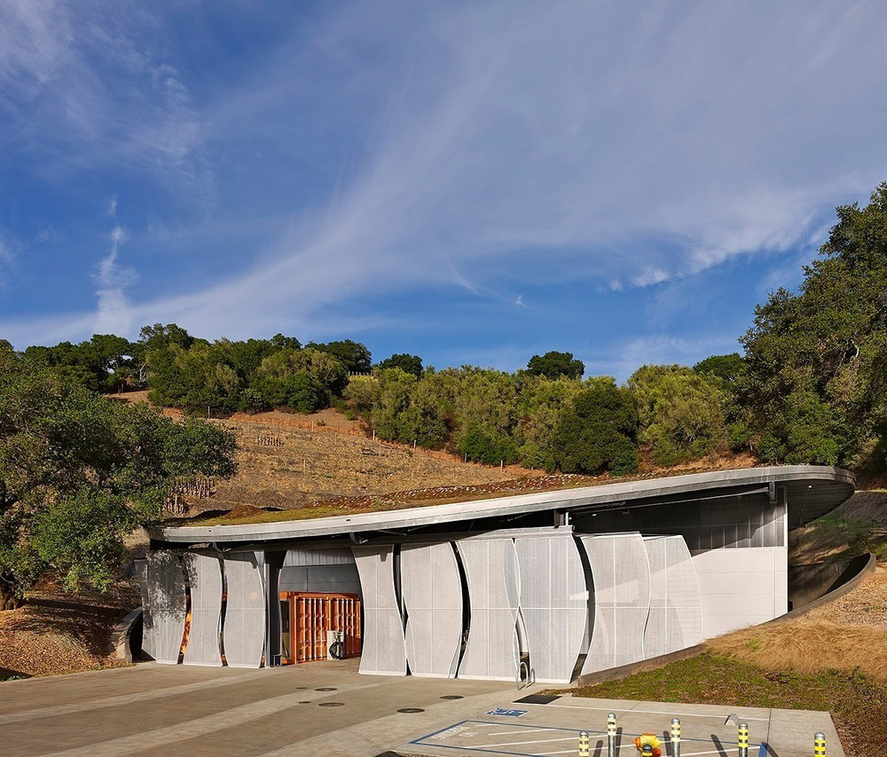 Nestled in the eastern hills of the valley, the "living" roof of the building seems to have been raised from the earth. At the front of the building, sliding screens of perforated aluminium in high and voluptuous shapes cover the crushing area, covered by the cellar and the outdoor workspace. Behind these screens, three re-adapted shipping containers serve as a comfortable and sophisticated laboratory for the cellar and office space.