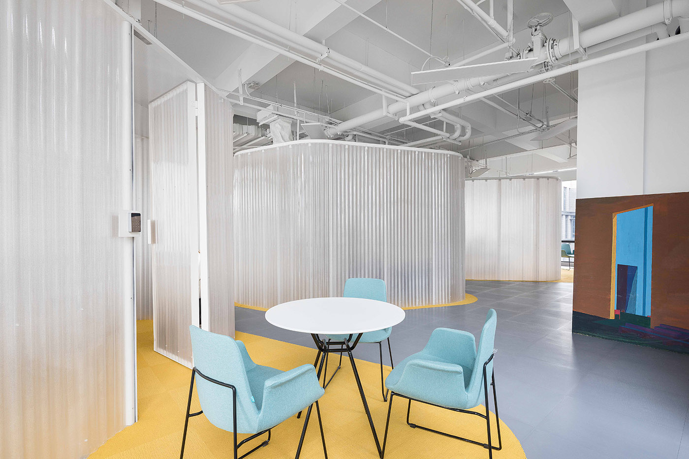 Bubbles float inside the space, encapsulating the spaces for private offices and meeting rooms, creating a connection between the inside and outside. The original space is fragmented, offering the possibility of choosing one's own work space according to the activities to be carried out, the number of people and the need for light and privacy.