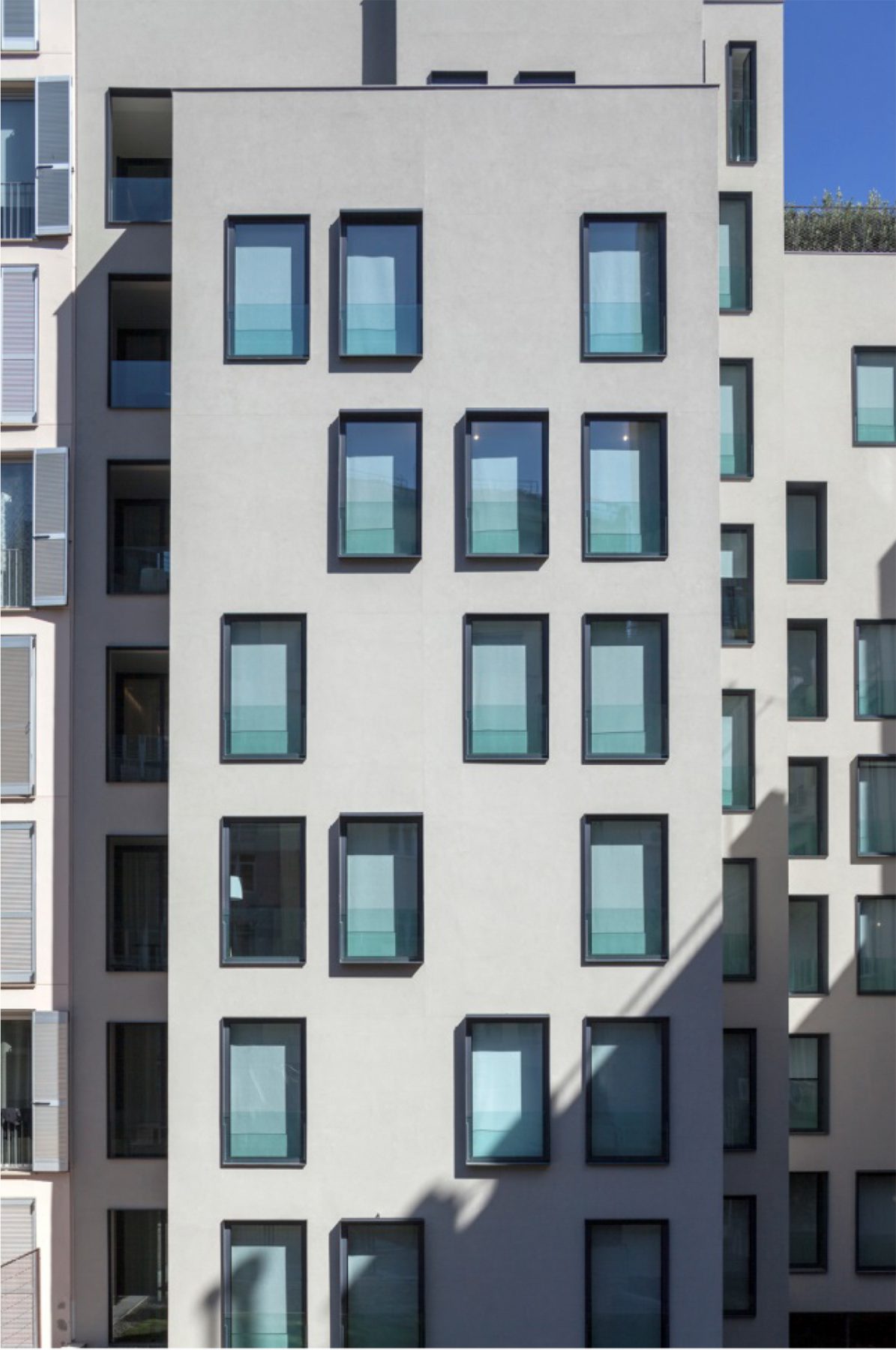 The facade is composed of 800 pieces of different sizes that make up a vast puzzle of vertical ceramic modules that blur the sequence and number of floors. The façade also has five large wooden frames: they are actually balconies that break the lines of the façade. This graphical combination of ceramic and wood animates the high façade, which would otherwise be too monumental and static