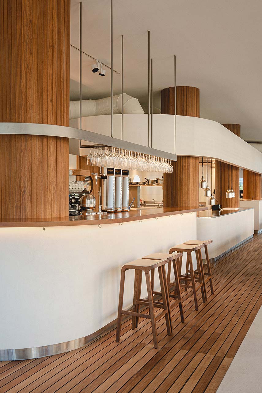 Just ten minutes by bus from Puerta del Sol on the banks of the Manzanares, the new La Maruca restaurant designed by Zooco Estudio forms a nautical club in the heart of the Spanish capital. It pays tribute to the great rationalist architectural jewels of Santander, such as the “Isla de Torre” Sailing School and the Real Club Marítimo.