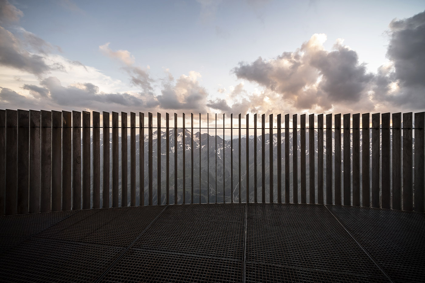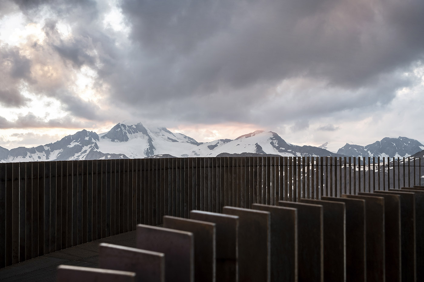 Speaking of time: in the wavy form, a slit with well-defined geometries directs the gaze towards the fascinating location of the discovery of Ötzi, the iceman. This element is also made of corten steel and, like the railing plates, is exposed to the weather, which has changed its color from dark brown to gray and finally to black, making it blend in with the surrounding environment.