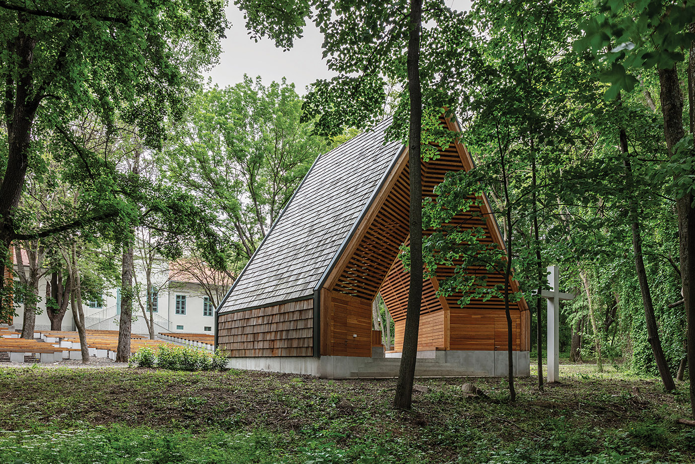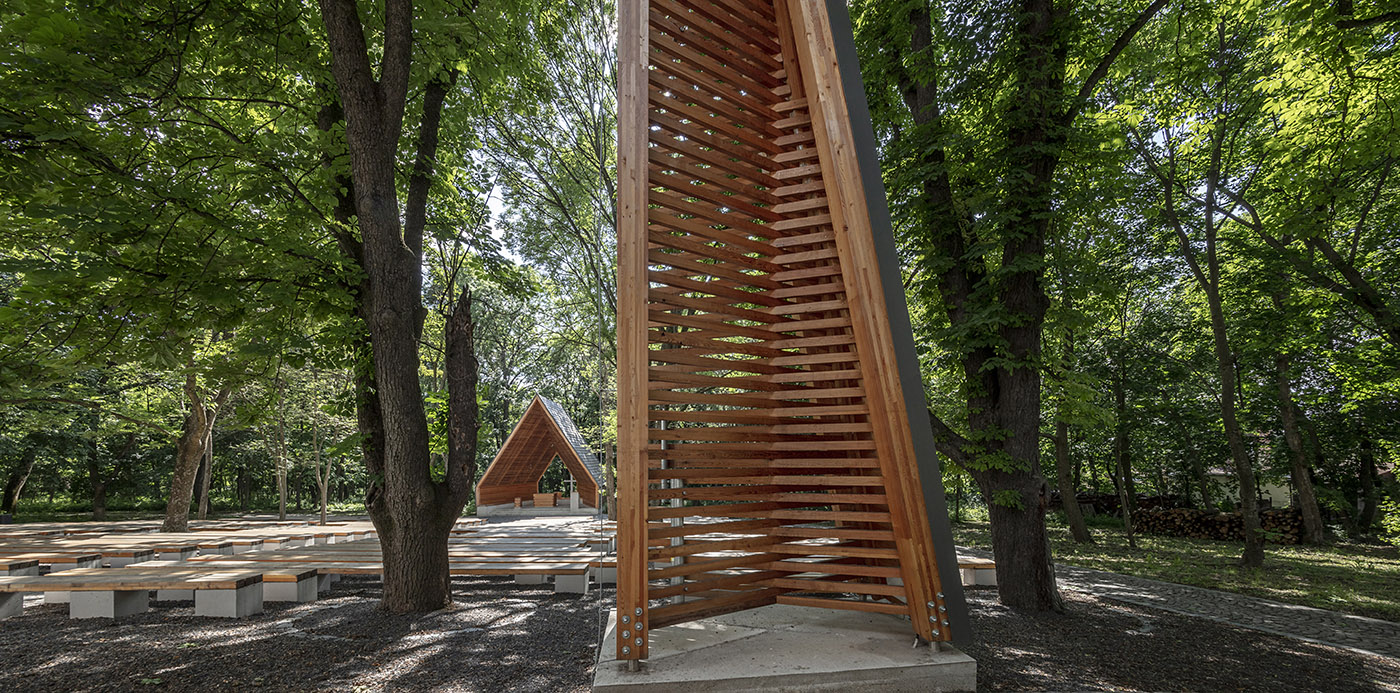 The open-air liturgical space was renovated and a new processional route was built, the turning point of which was a glade opening onto the adjacent field. An old residence located in the wooded area was renovated together with the adjoining church