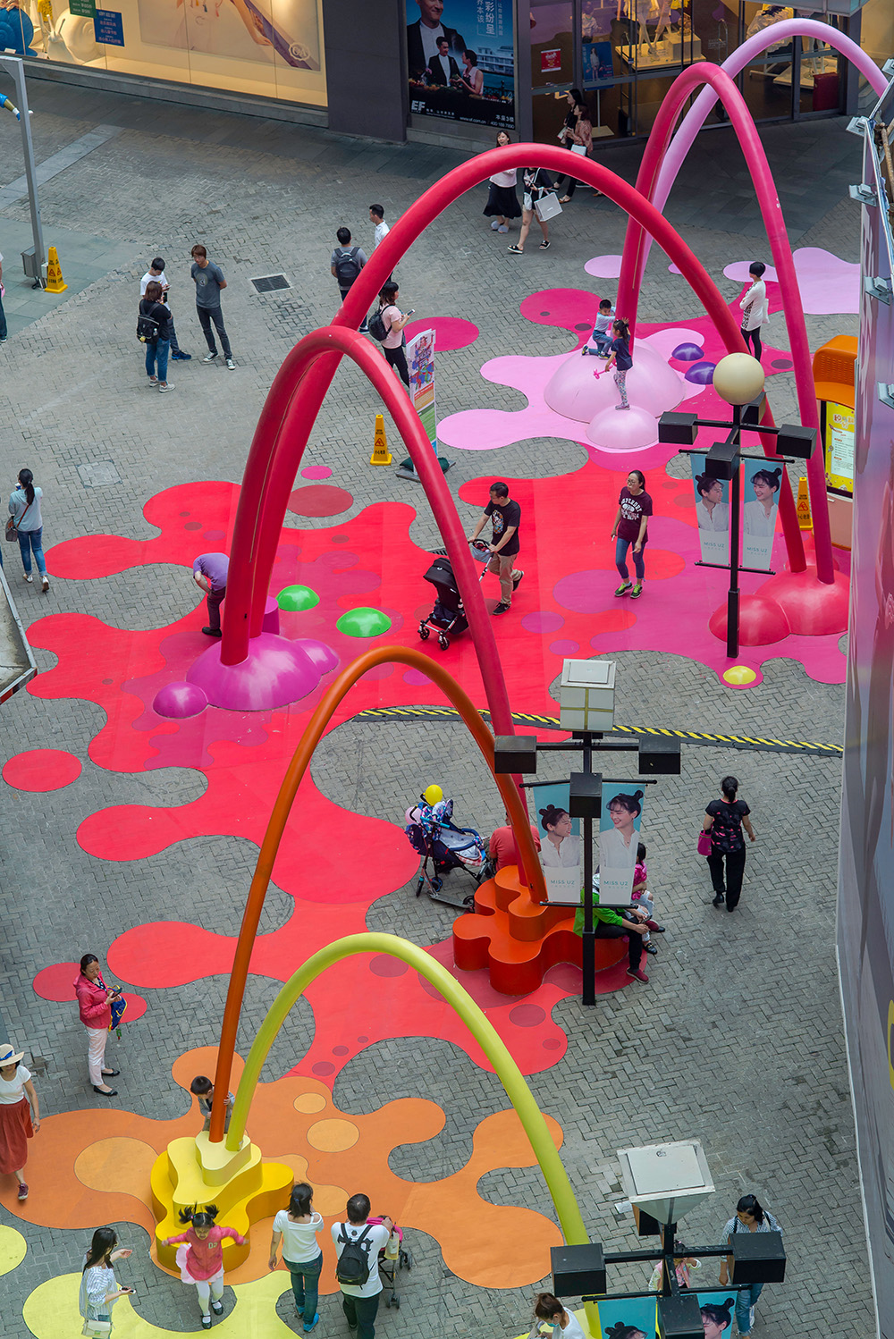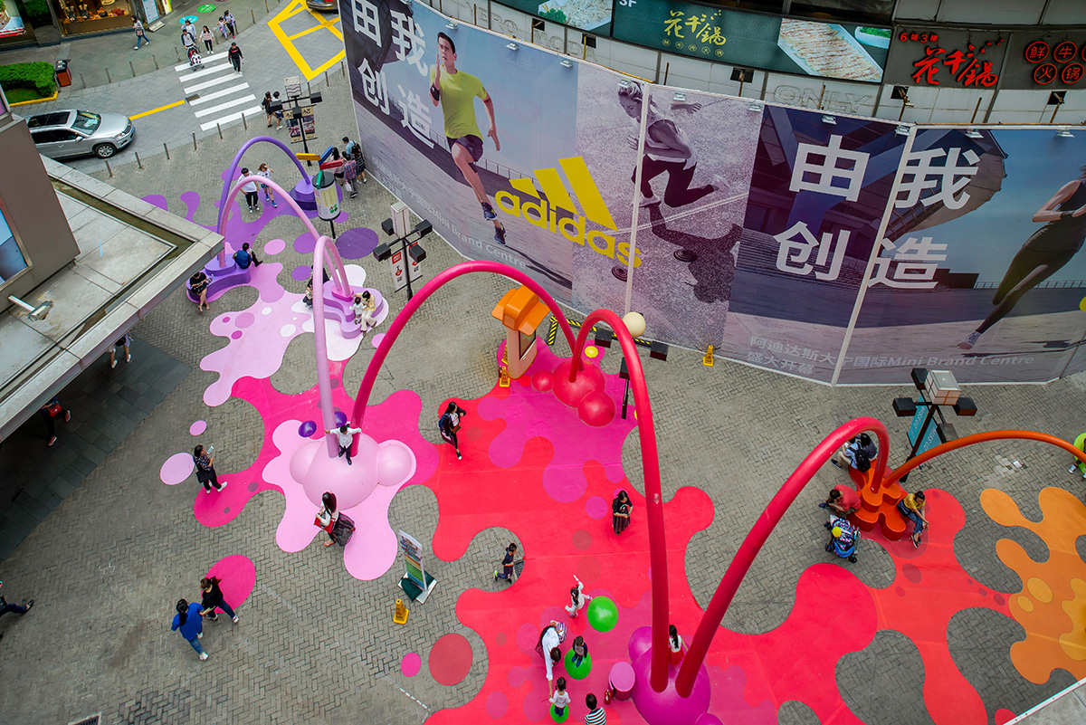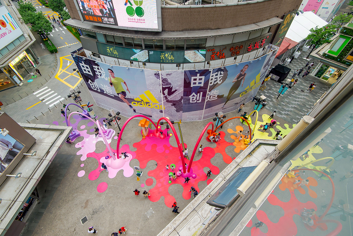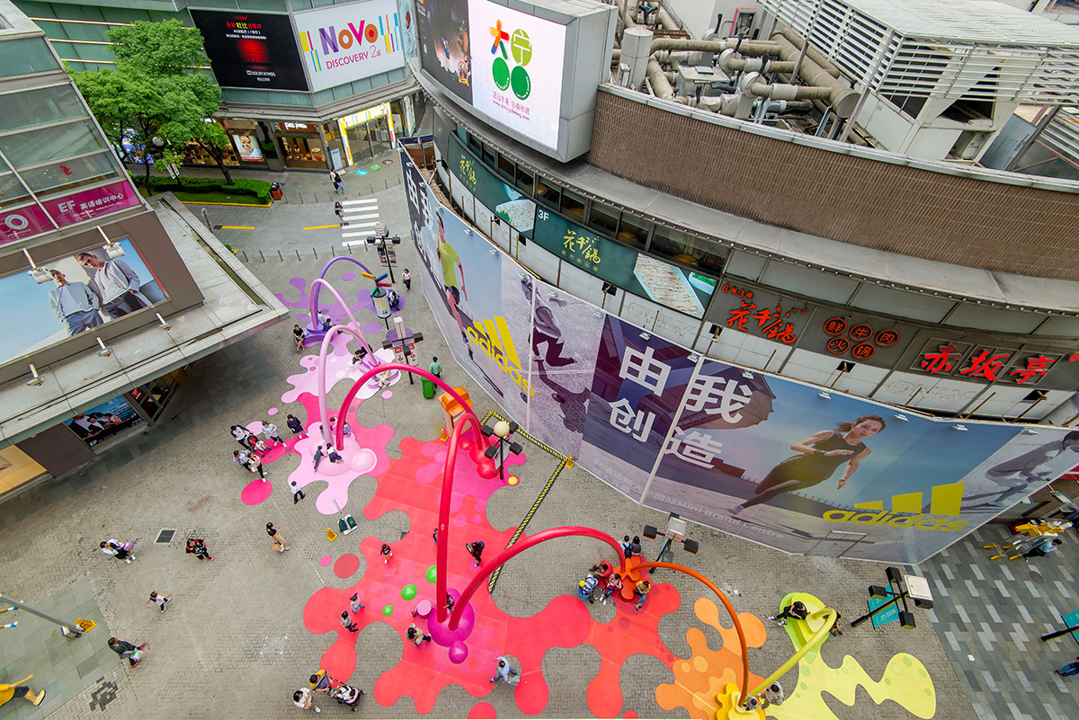 The architecture studio 100architects intervenes in a public space in Shanghai, China, created as a visual link between the main square and a new sales space, colouring it with drops and arches of paint that reach the floor