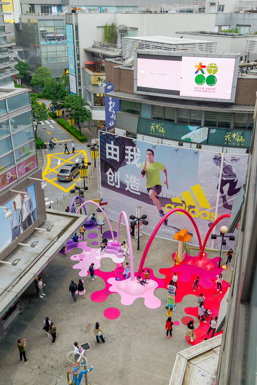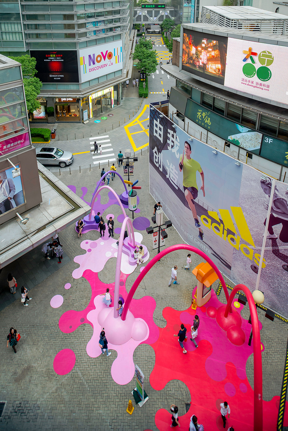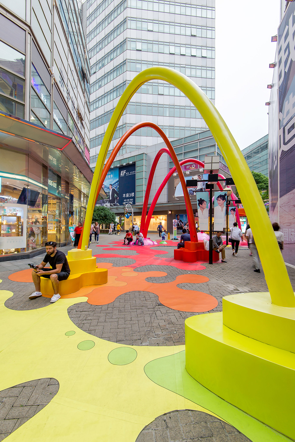 The architecture studio 100architects intervenes in a public space in Shanghai, China, created as a visual link between the main square and a new sales space, colouring it with drops and arches of paint that reach the floor