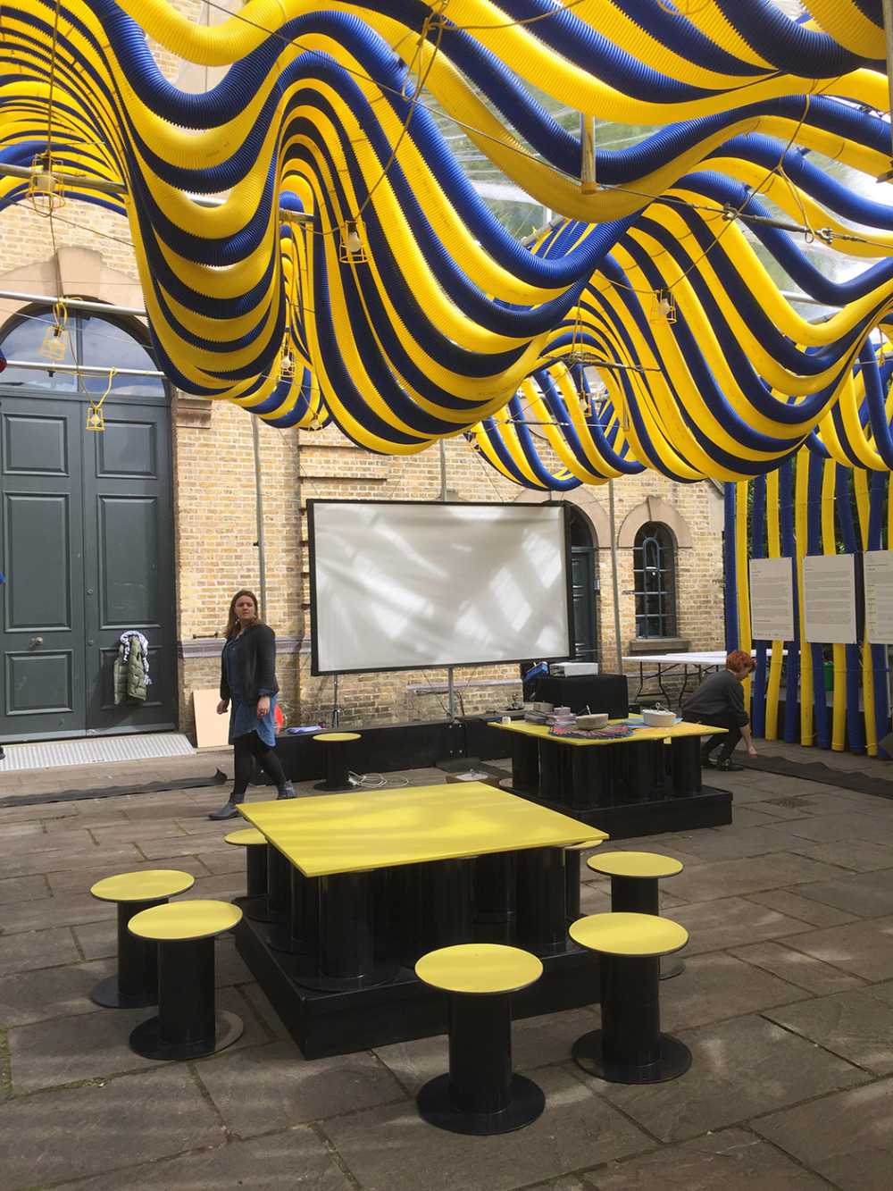 The 14 x 3.5 metre structure was part of the Wandsworth Arts Fringe and was used to host screenings, workshops and performances. Its design is the result of several months of dialogue with students at Chestnut Grove Academy in Balham, led by NEON architects and Elliot Wood structural engineers