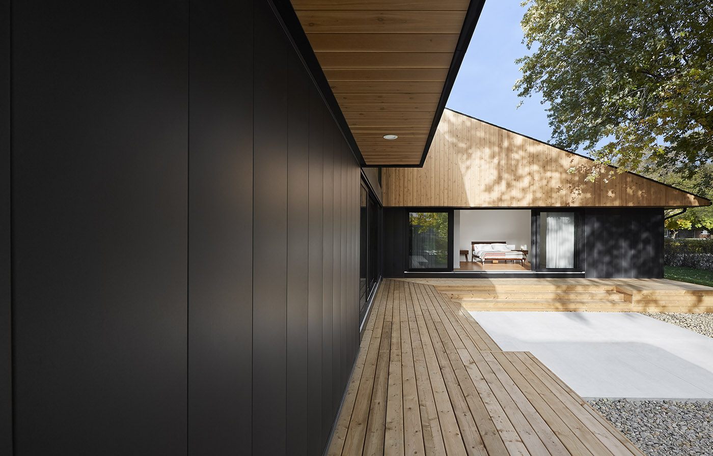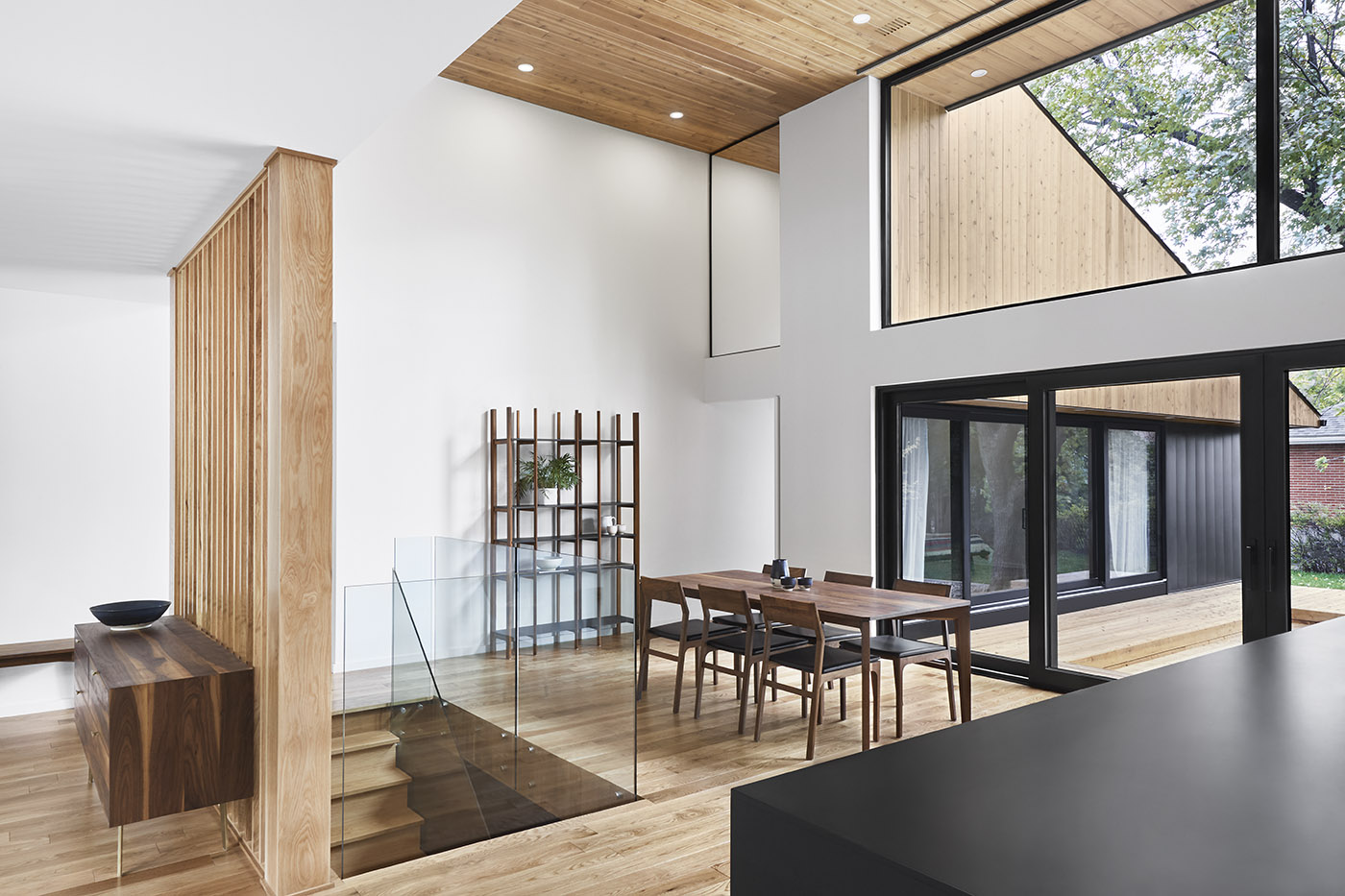 The L-shaped floor plan of the house is divided into four zones with the heart of the house at the center, the kitchen becomes a warm and welcoming space for the whole family. Central to the design of the new home was the large maple tree located in the heart of the garden, which became an architectural element in its own right and was honored for its ecological, aesthetic and social benefits. In addition, the team planted three new trees to reduce the heat island effect
